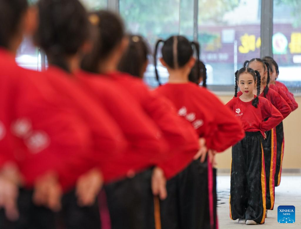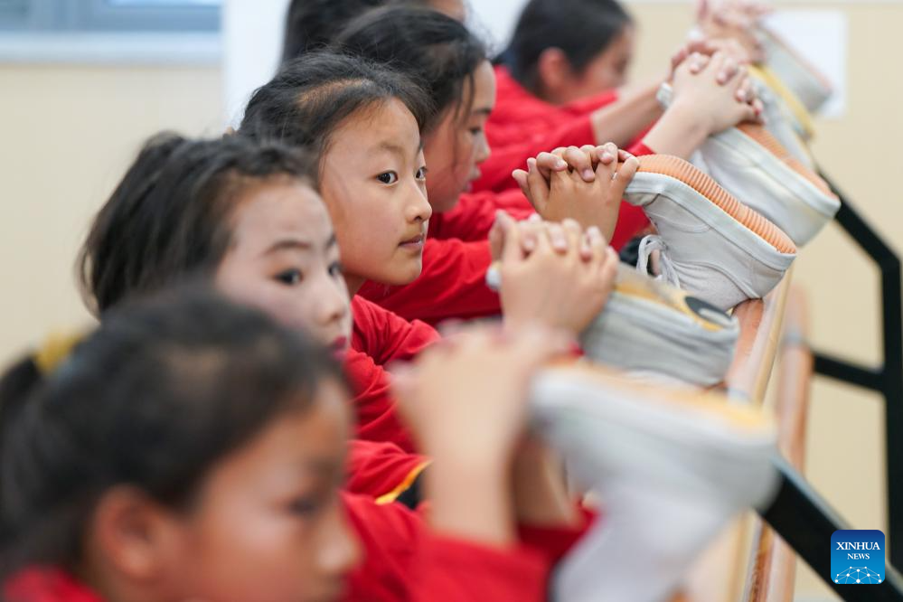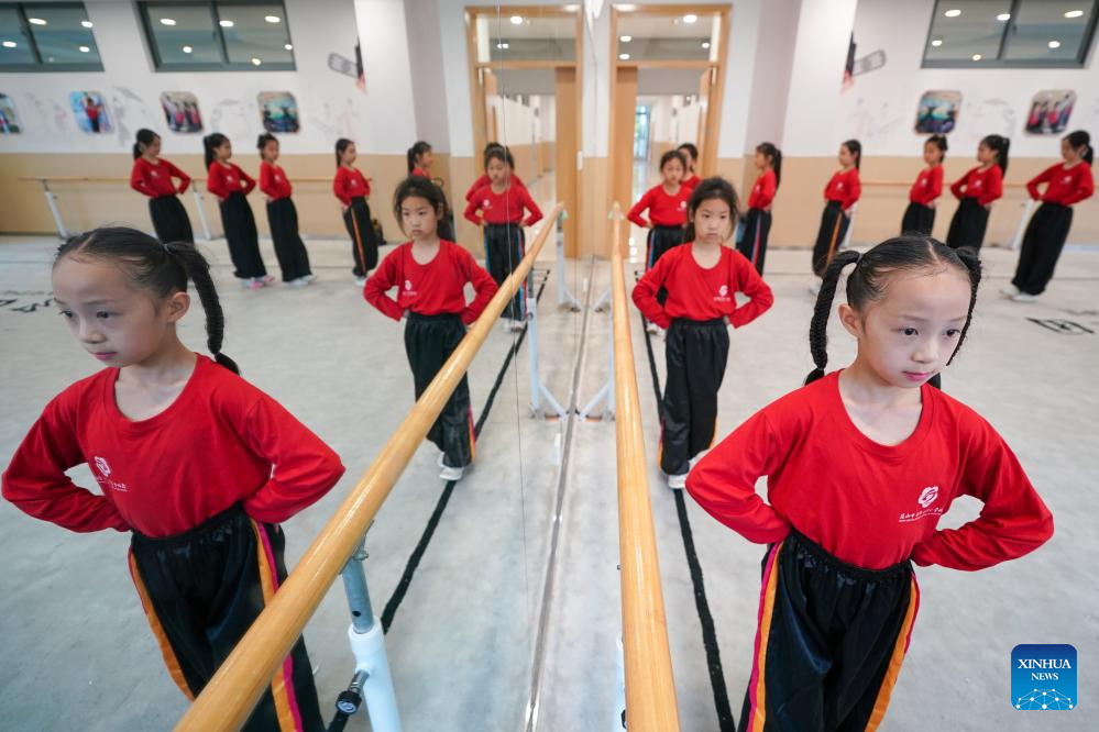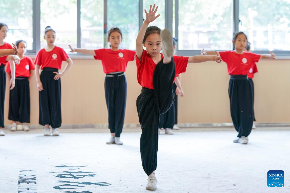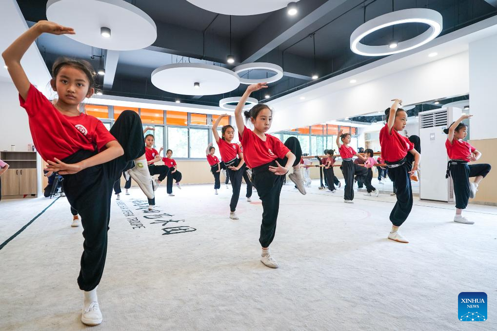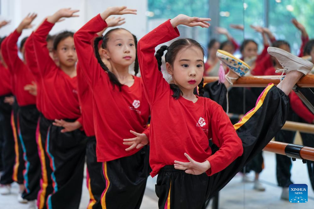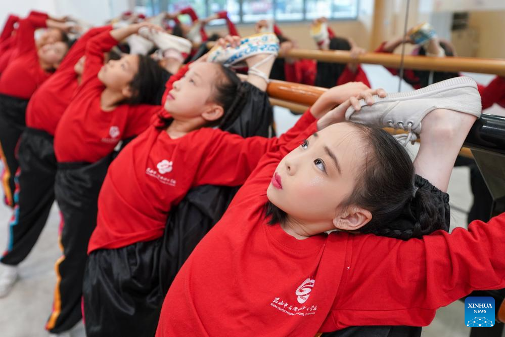 Xie Suqian (1st R), a pupil of the "little Kunqu Opera training class", practices basic skills of Kunqu Opera with her classmates at Shipai Center Primary School of Kunshan in Kunshan City, east China's Jiangsu Province, May 30, 2024.(Xinhua/Li Bo)