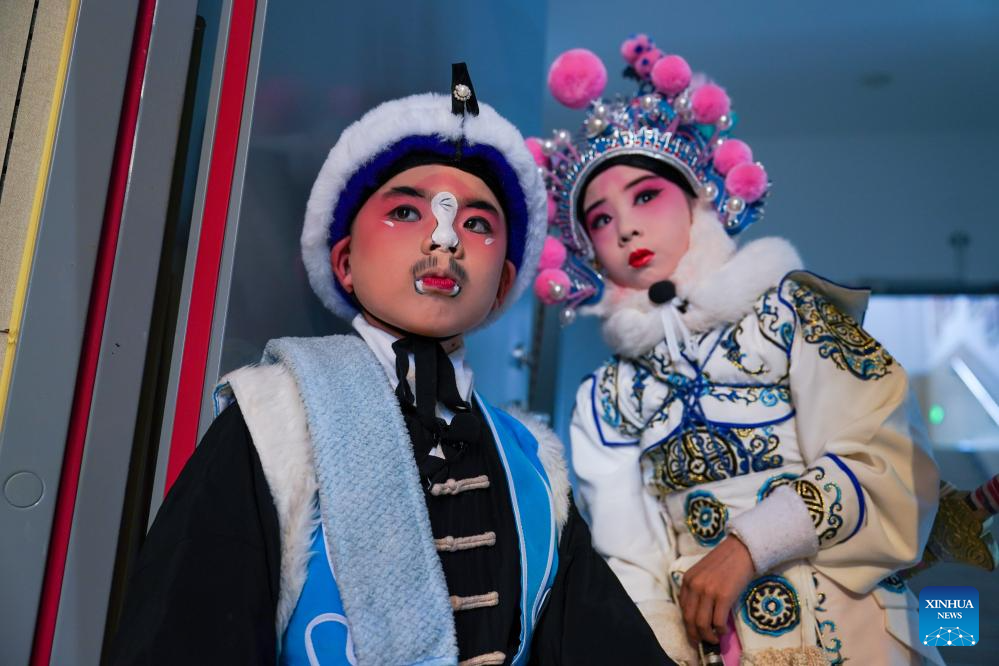 Zhang Zixuan (L) and Xie Suqian, pupils of the "little Kunqu Opera training class" of Shipai Center Primary School, wait for a Kunqu Opera performance in Kunshan City, east China's Jiangsu Province, May 31, 2024.(Xinhua/Li Bo)