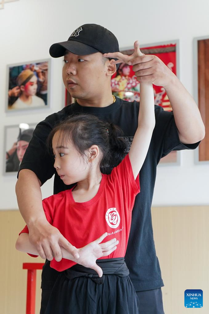 A pupil of the "little Kunqu Opera training class" practices basic skills of Kunqu Opera under the guidance of a teacher at Shipai Center Primary School of Kunshan in Kunshan City, east China's Jiangsu Province, May 26, 2024.(Xinhua/Li Bo)