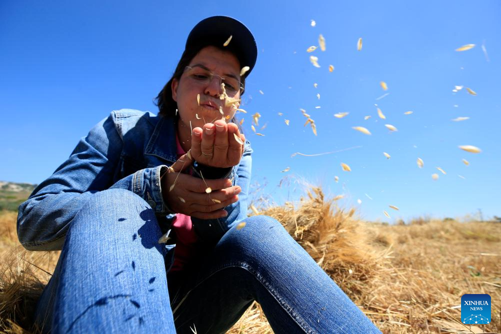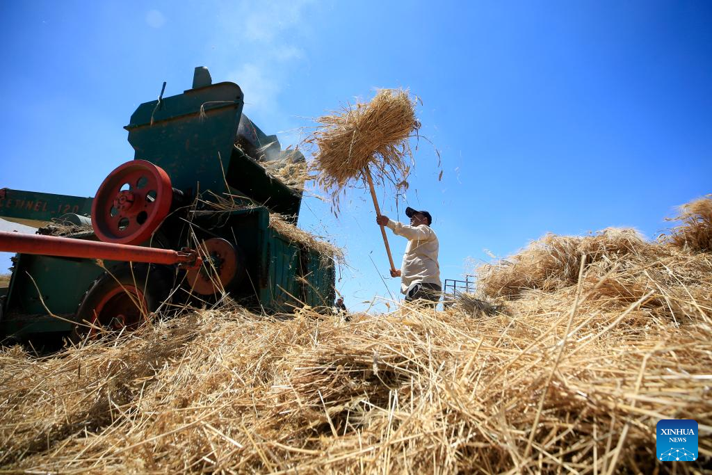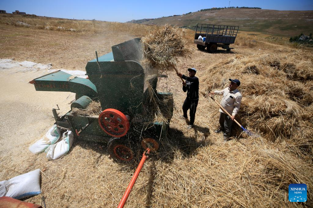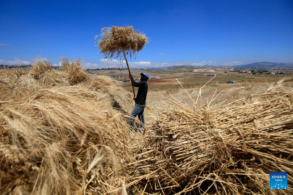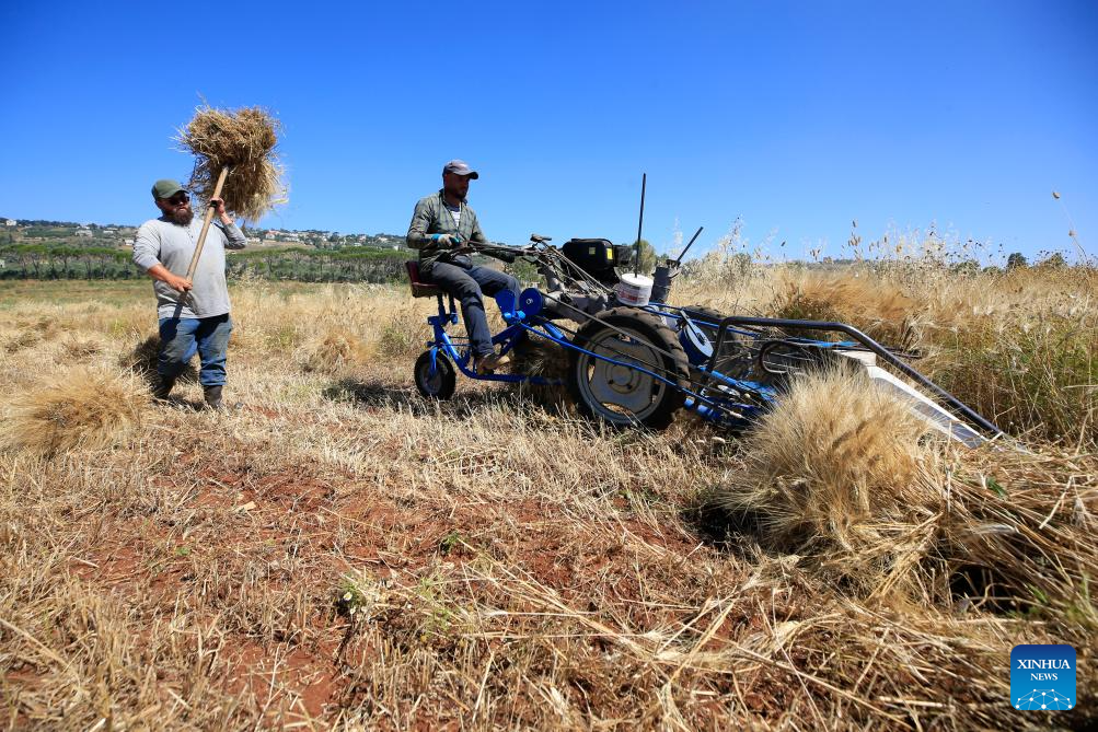 Lebanese farmers harvest wheat in Marjeyoun, Lebanon, on May 29, 2024. (Photo by Ali Hashisho/Xinhua)