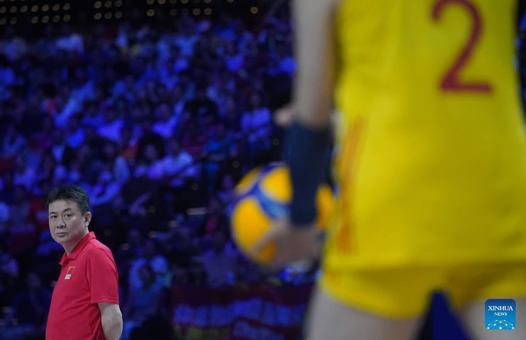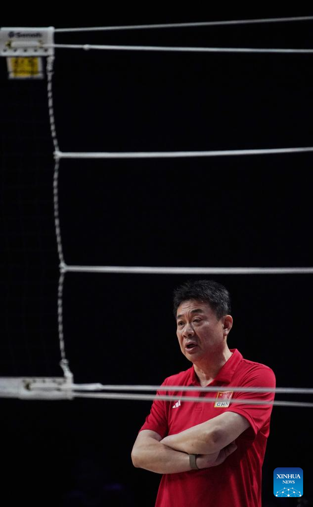 Cai Bin, head coach of China, looks on during the preliminary match between Thailand and China at the Women's Volleyball Nations League 2024 Macao in Macao, south China, June 1, 2024. (Xinhua/Lui Sui Wai)