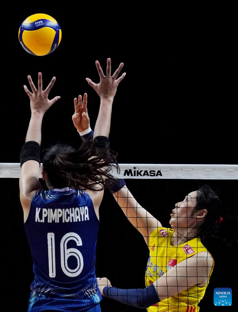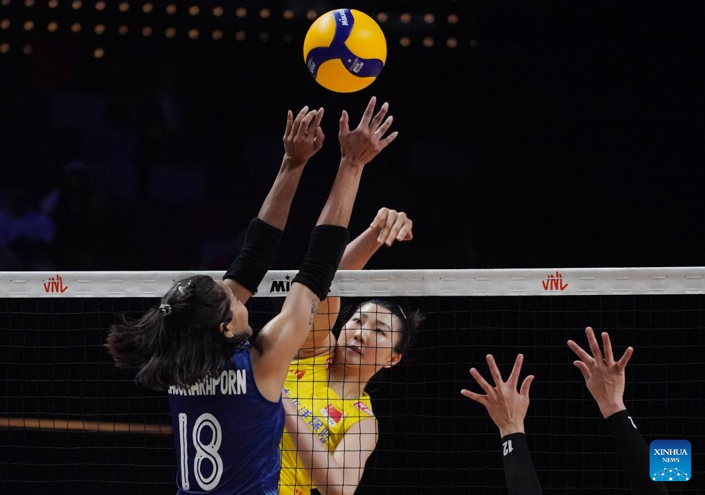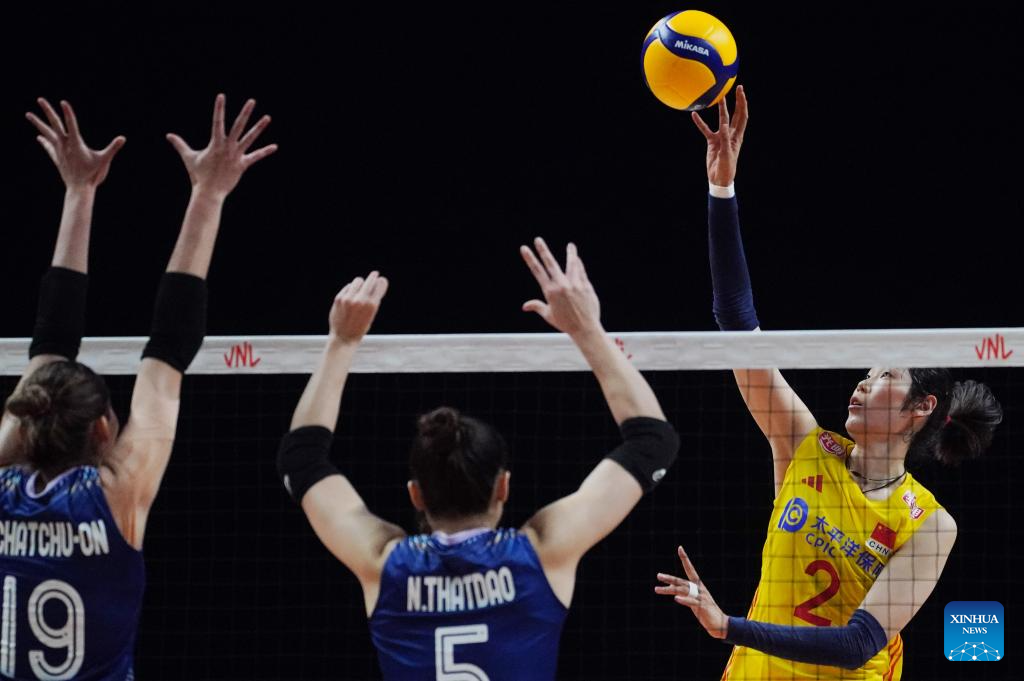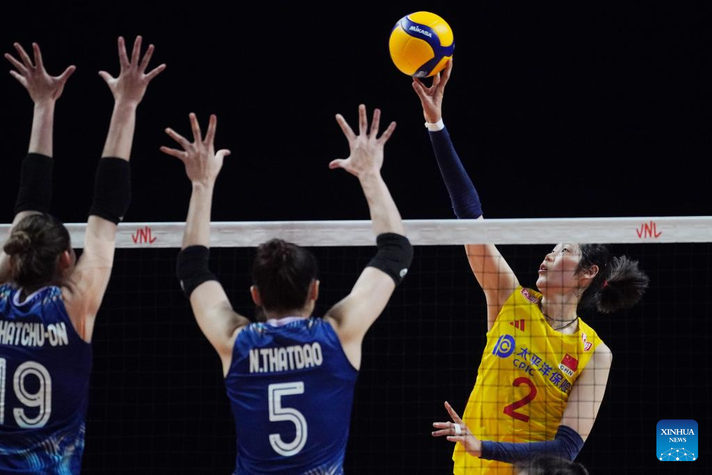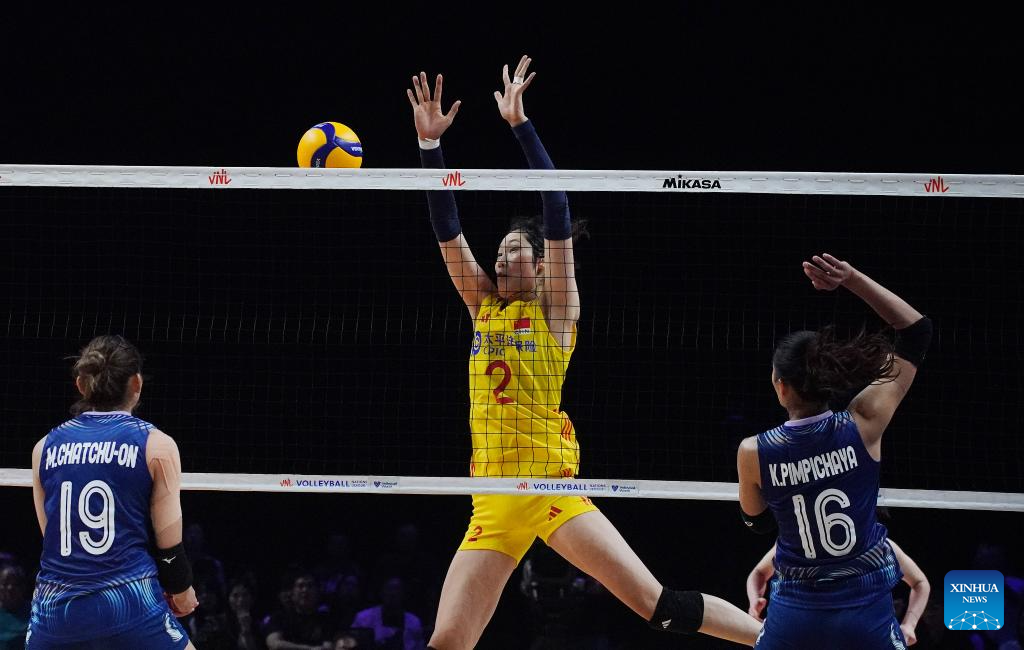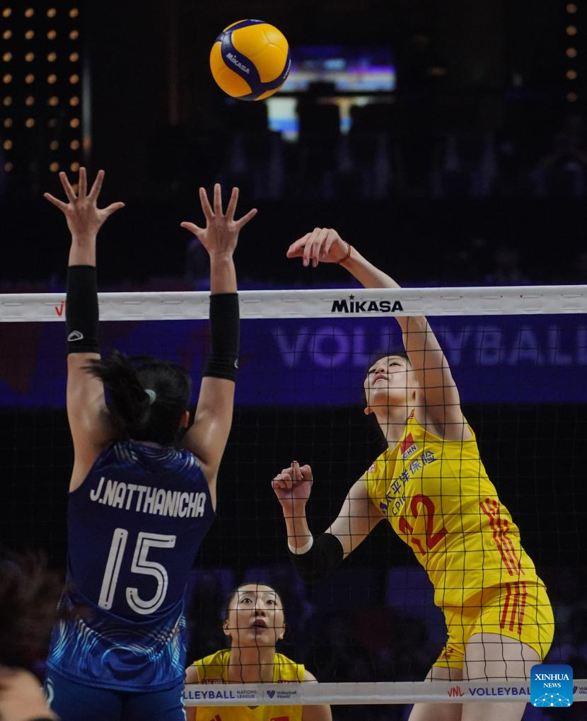 Li Yingying (R) of China spikes the ball during the preliminary match between Thailand and China at the Women's Volleyball Nations League 2024 Macao in Macao, south China, June 1, 2024. (Xinhua/Lui Sui Wai)