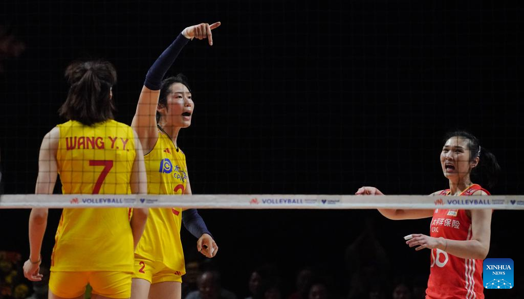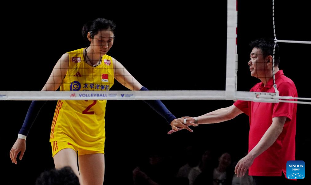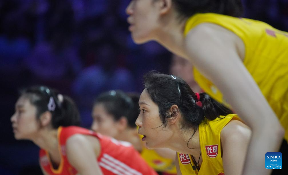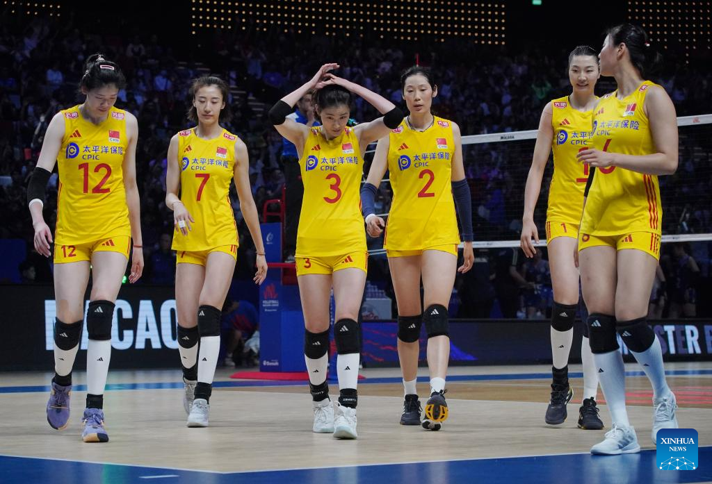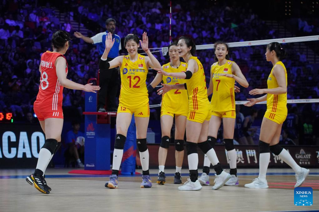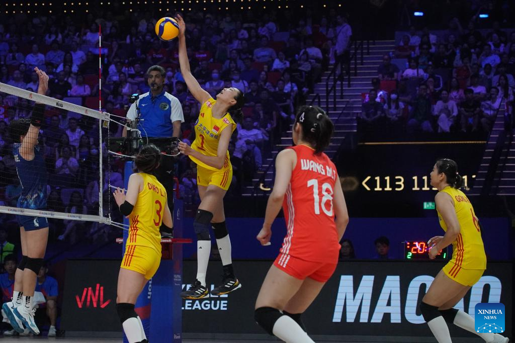 Players of China are seen during the preliminary match between Thailand and China at the Women's Volleyball Nations League 2024 Macao in Macao, south China, June 1, 2024. (Xinhua/Lui Sui Wai)