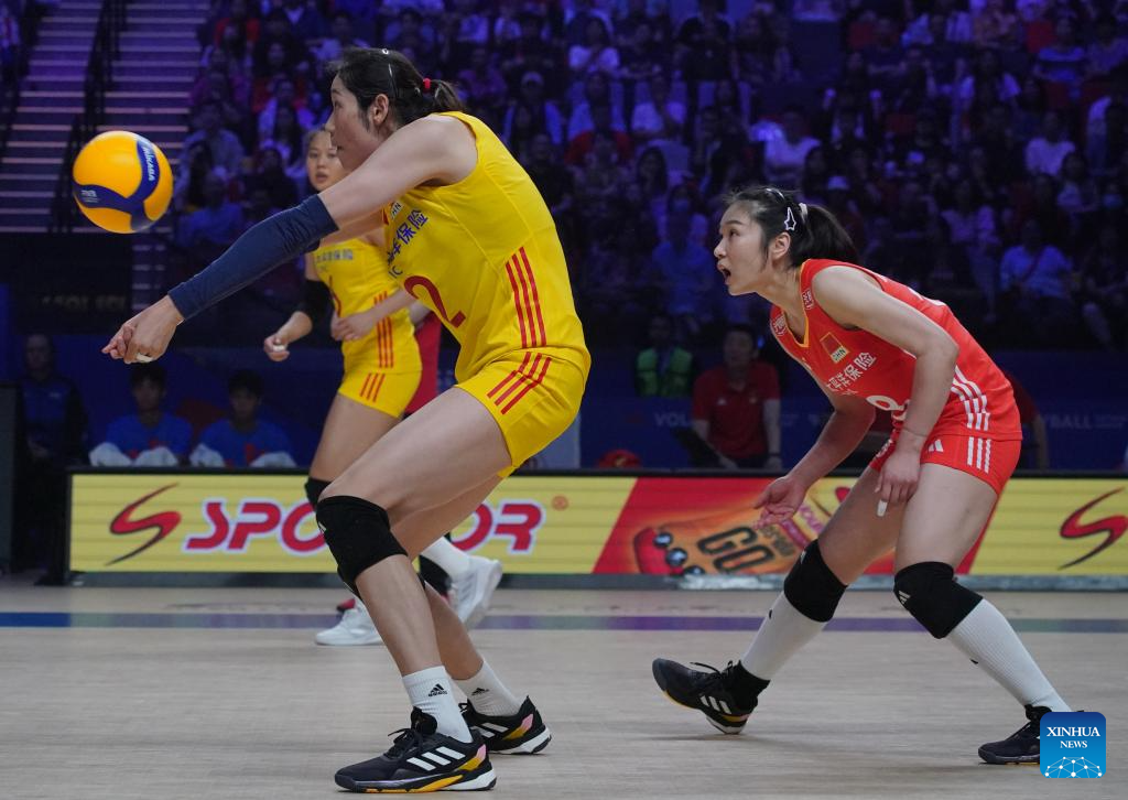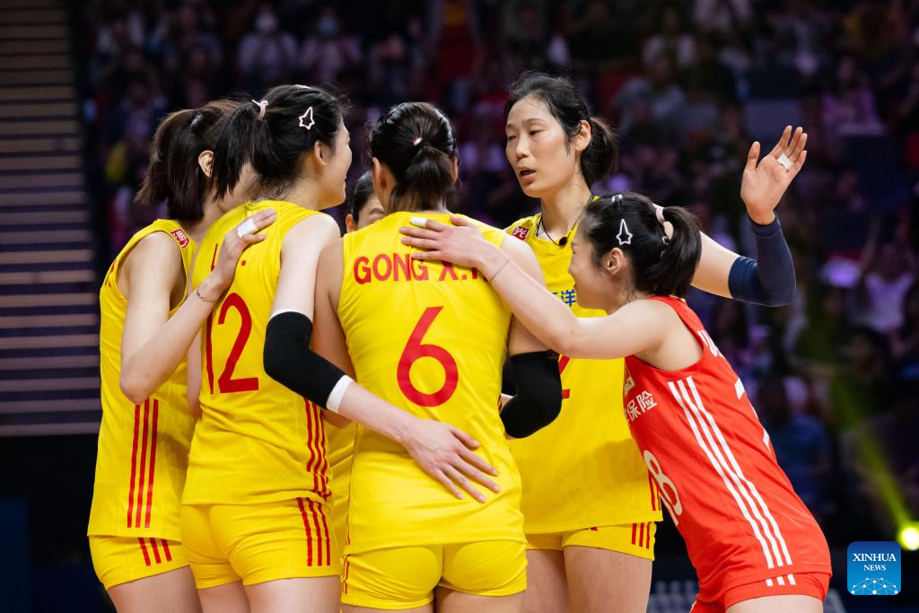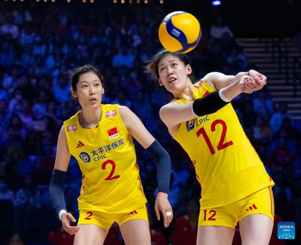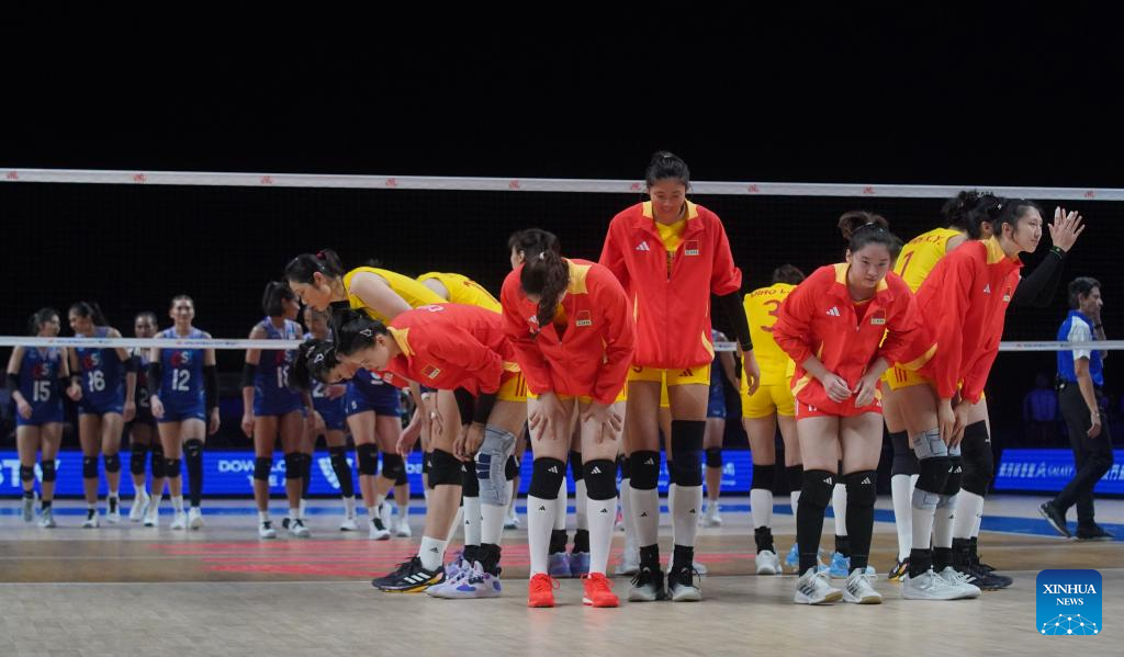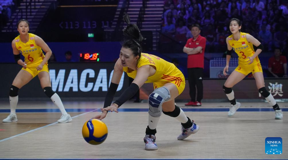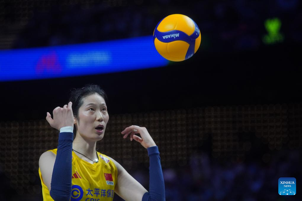 Players of China are seen during the preliminary match between Thailand and China at the Women's Volleyball Nations League 2024 Macao in Macao, south China, June 1, 2024. (Xinhua/Lui Sui Wai)