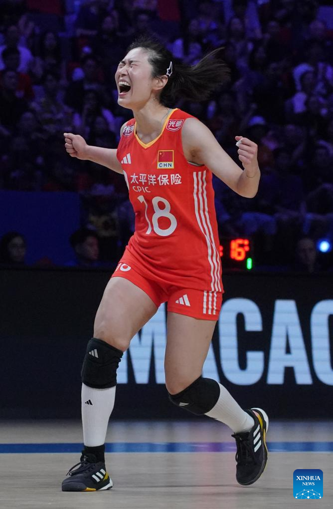 Wang Mengjie of China celebrates scoring during the preliminary match between Thailand and China at the Women's Volleyball Nations League 2024 Macao in Macao, south China, June 1, 2024. (Xinhua/Lui Sui Wai)