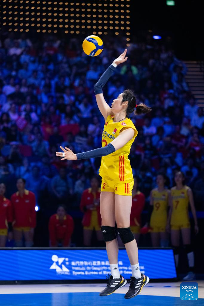 Yuan Xinyue of China spikes the ball during the preliminary match between Thailand and China at the Women's Volleyball Nations League 2024 Macao in Macao, south China, June 1, 2024. (Xinhua/Lui Sui Wai)