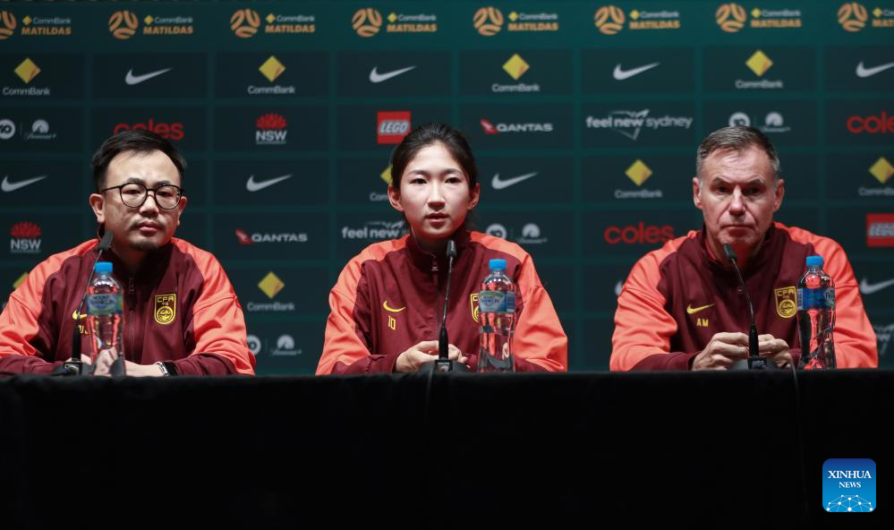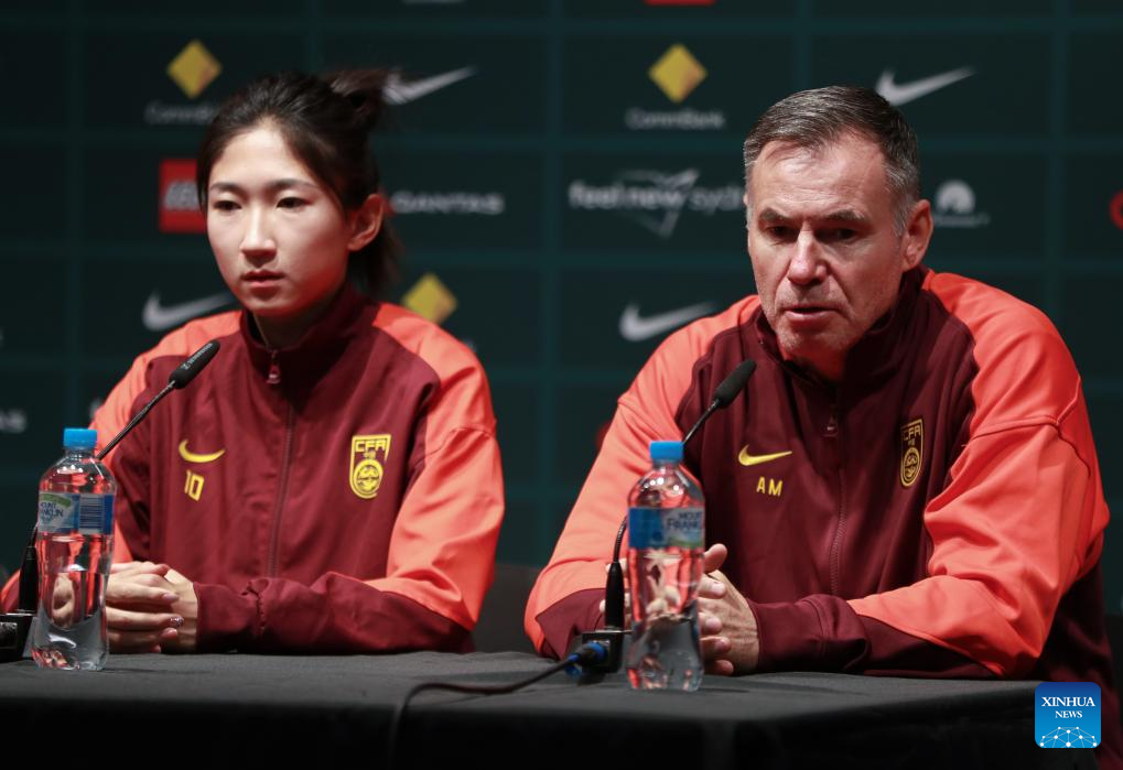 Ante Milicic (R), head coach of the Chinese national women's football team, and player Wang Yanwen (C) attend the press conference prior to the friendly match between China and Australia in Sydney, Australia, June 2, 2024. (Xinhua/Ma Ping)