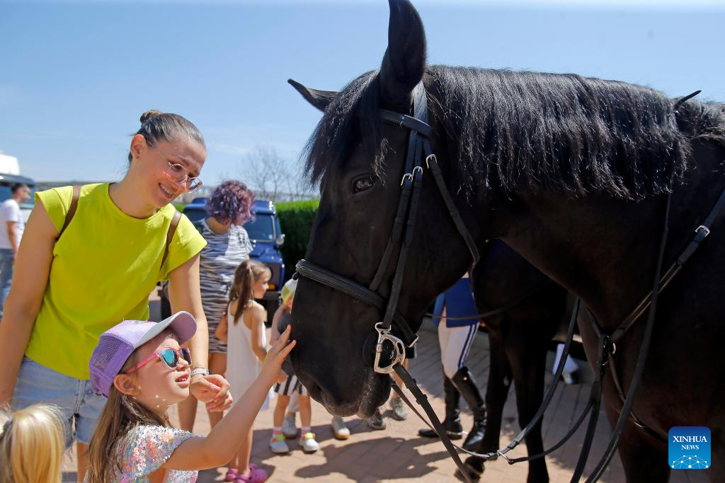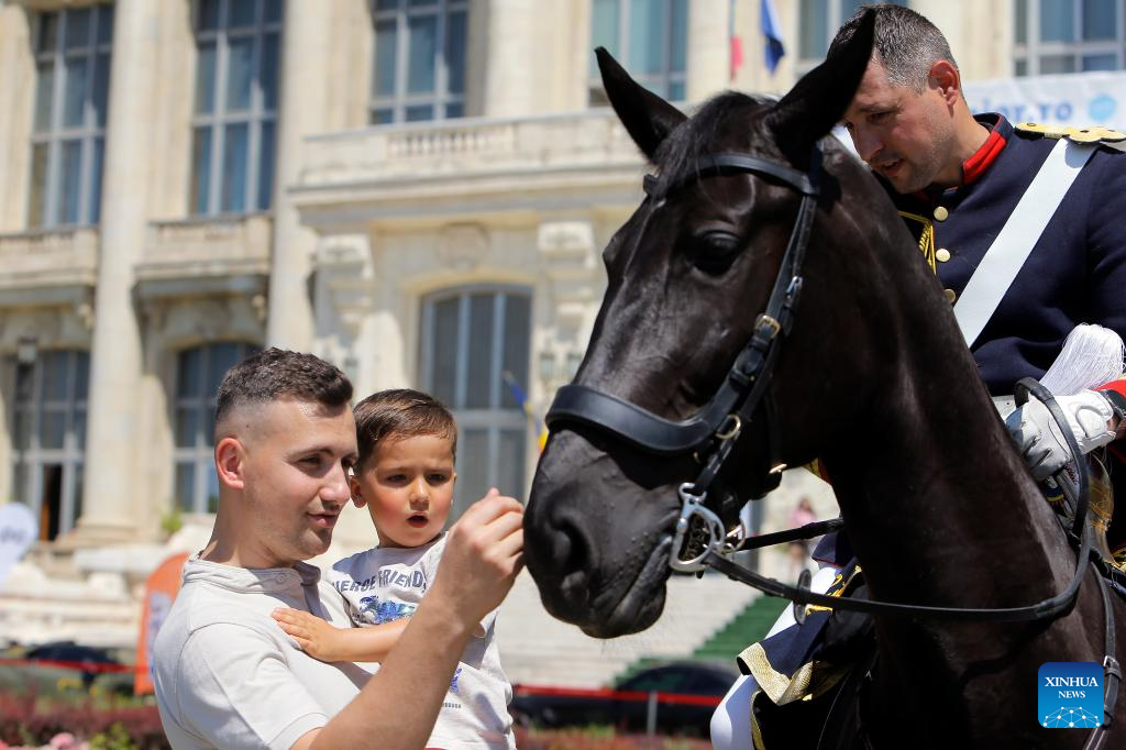 People interact with a parade horse during an open-door event marking the International Children's Day at Romania's Parliament Palace in Bucharest, Romania, June 1, 2024. (Photo by Cristian Cristel/Xinhua)