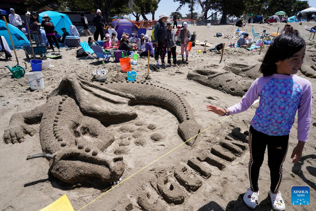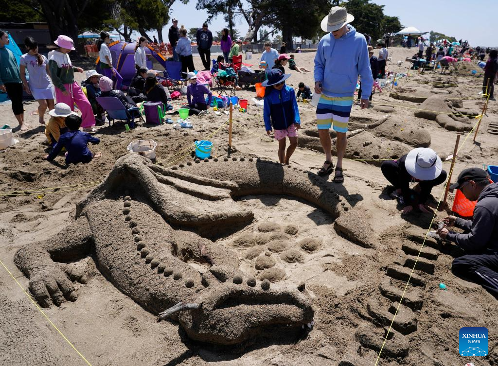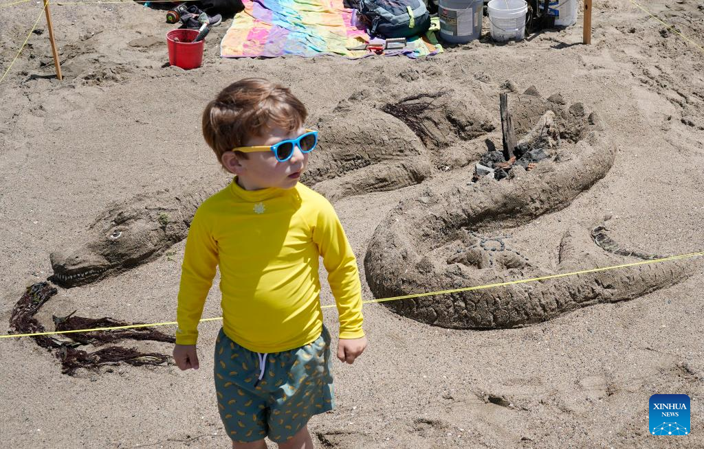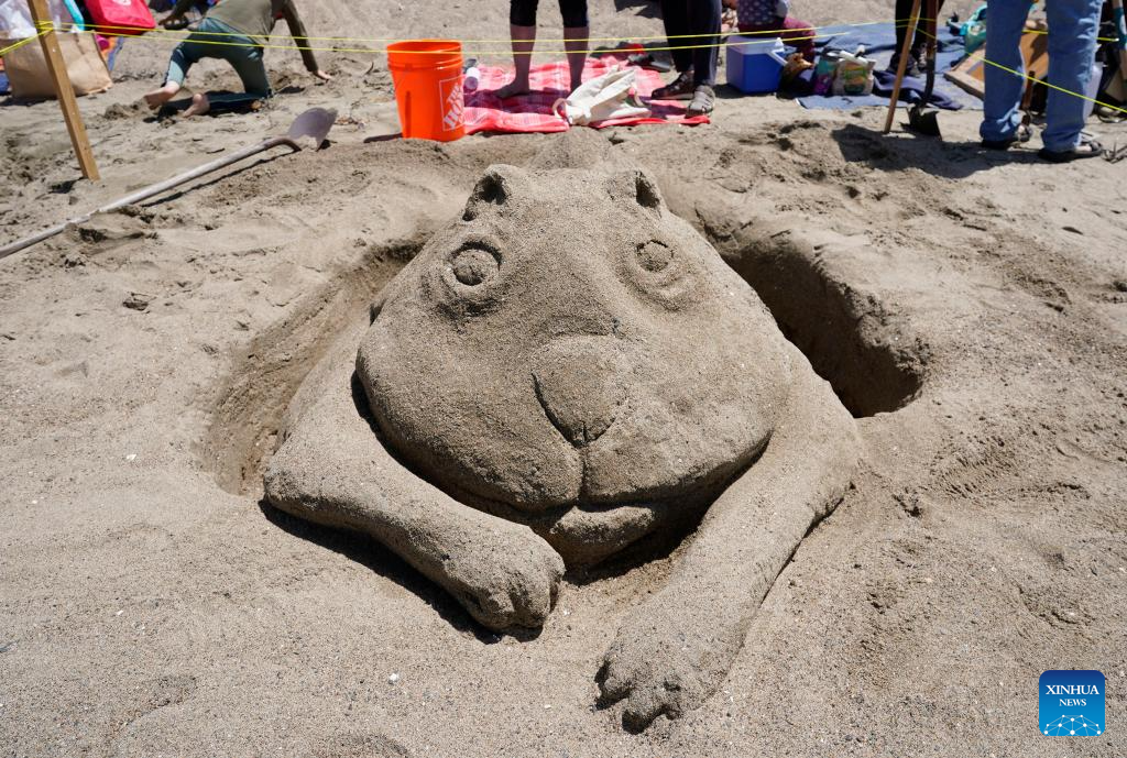 This photo taken on June 1, 2024 shows a sandcastle work created by competitors during a sandcastle competition in San Francisco, the United States. (Photo by Li Jianguo/Xinhua)