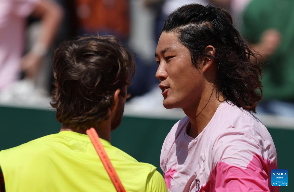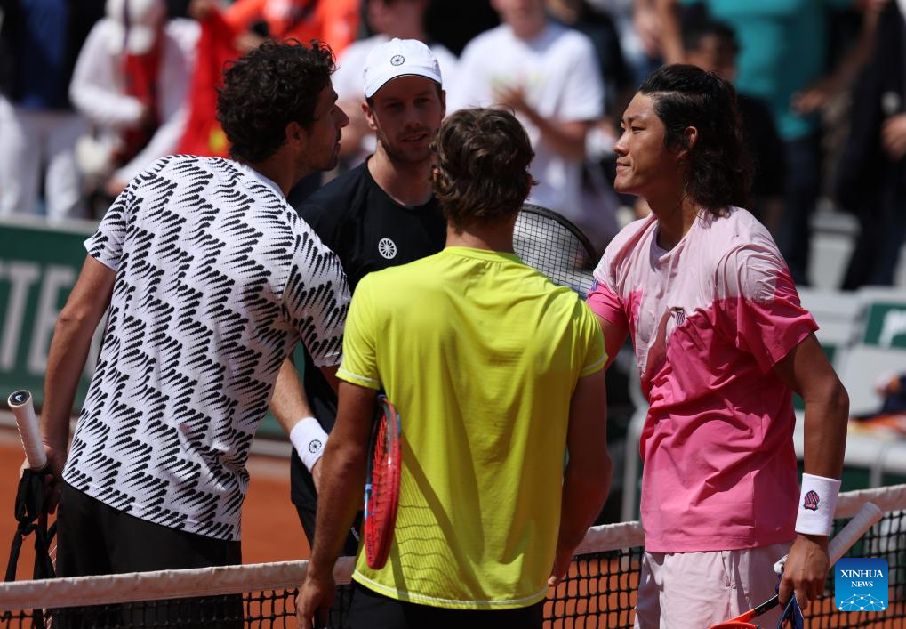 Zhang Zhizhen (1st R)/Tomas Machac (2nd R) greet Robin Haase (1st L)/Botic Van de Zandschulp after the men's doubles second round match between Zhang Zhizhen (China)/Tomas Machac (the Czech Republic) and Robin Haase/Botic Van de Zandschulp of the Netherlands at the French Open tennis tournament at Roland Garros in Paris, France, on June 3, 2024. (Xinhua/Gao Jing)