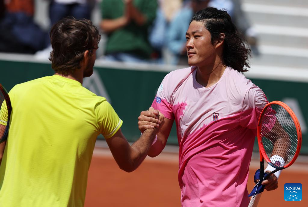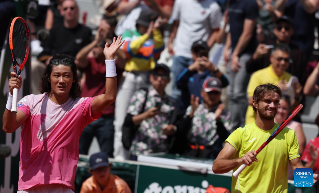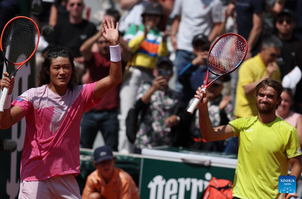 Zhang Zhizhen (R)/Tomas Machac celebrate their victory after the men's doubles second round match between Zhang Zhizhen (China)/Tomas Machac (the Czech Republic) and Robin Haase/Botic Van de Zandschulp of the Netherlands at the French Open tennis tournament at Roland Garros in Paris, France, on June 3, 2024. (Xinhua/Gao Jing)