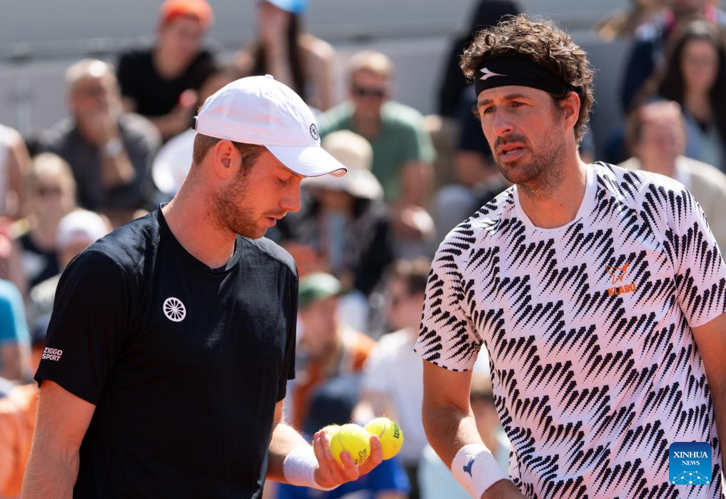 Robin Haase (R)/Botic Van de Zandschulp react during the men's doubles second round match between Zhang Zhizhen (China)/Tomas Machac (the Czech Republic) and Robin Haase/Botic Van de Zandschulp of the Netherlands at the French Open tennis tournament at Roland Garros in Paris, France, on June 3, 2024. (Xinhua/Gao Jing)
