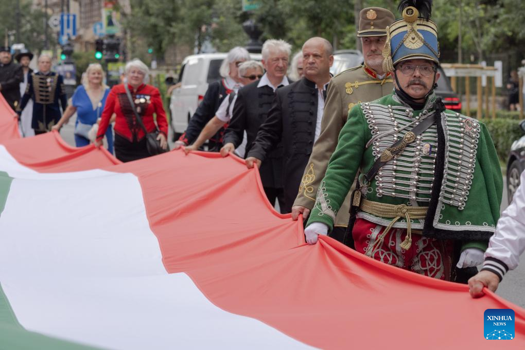People march with a 1,848-meter-long Hungarian flag to celebrate the Day of National Unity in Budapest, Hungary, on June 2, 2024. June 4 marks Hungary's Day of National Unity. (Photo by Attila Volgyi/Xinhua)
