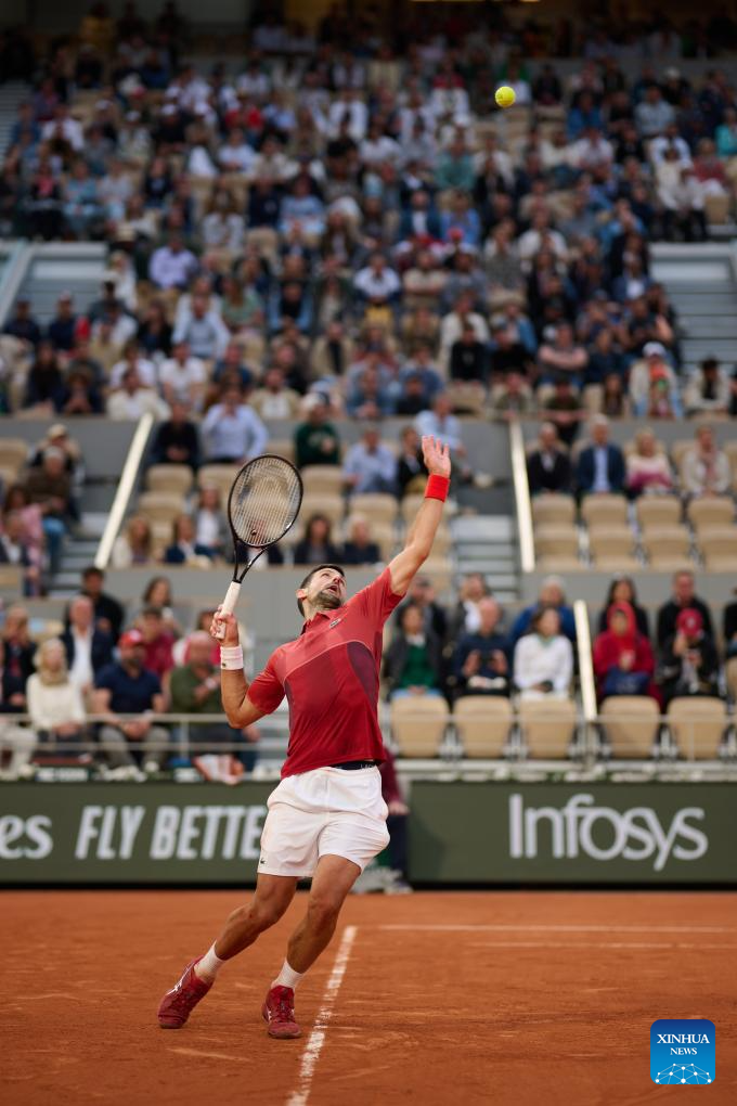 Novak Djokovic serves the ball during the men's singles fourth round match between Novak Djokovic of Serbia and Francisco Cerundolo of Argentina at the French Open tennis tournament at Roland Garros, Paris, France, June 3, 2024. (Xinhua/Meng Dingbo)