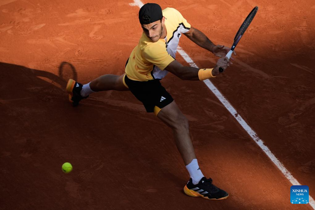 Francisco Cerundolo hits a return during the men's singles fourth round match between Novak Djokovic of Serbia and Francisco Cerundolo of Argentina at the French Open tennis tournament at Roland Garros, Paris, France, June 3, 2024. (Xinhua/Meng Dingbo)
