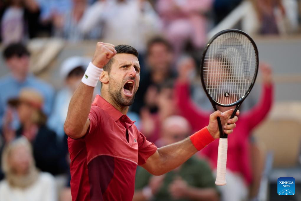 Novak Djokovic celebrates scoring during the men's singles fourth round match between Novak Djokovic of Serbia and Francisco Cerundolo of Argentina at the French Open tennis tournament at Roland Garros, Paris, France, June 3, 2024. (Xinhua/Meng Dingbo)