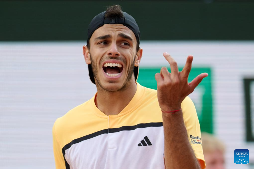 Francisco Cerundolo reacts during the men's singles fourth round match between Novak Djokovic of Serbia and Francisco Cerundolo of Argentina at the French Open tennis tournament at Roland Garros, Paris, France, June 3, 2024. (Xinhua/Meng Dingbo)