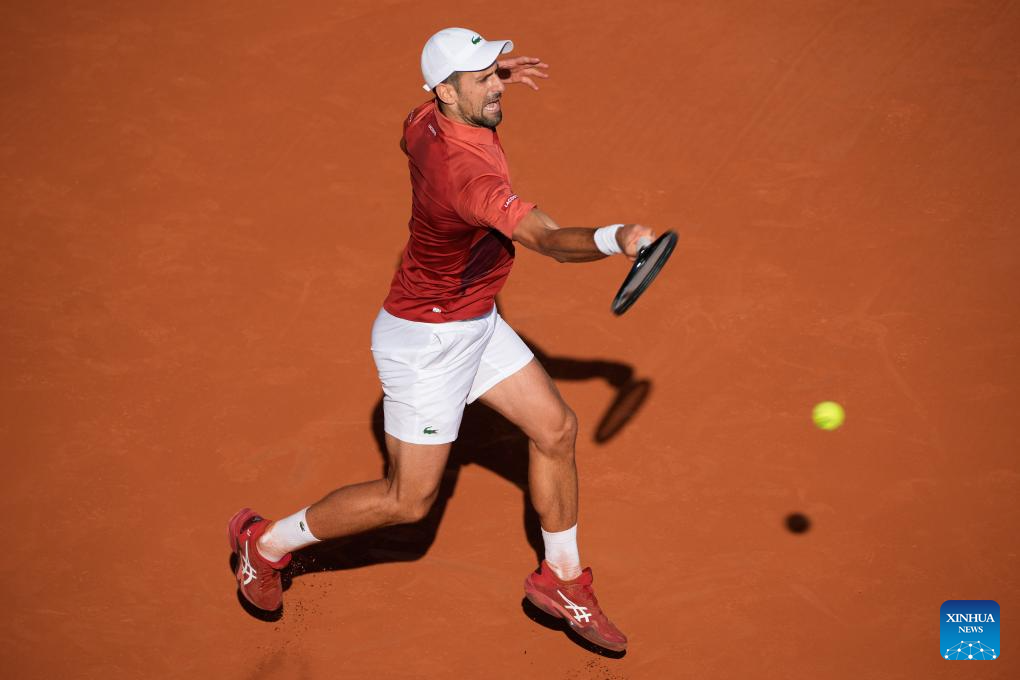 Novak Djokovic hits a return during the men's singles fourth round match between Novak Djokovic of Serbia and Francisco Cerundolo of Argentina at the French Open tennis tournament at Roland Garros, Paris, France, June 3, 2024. (Xinhua/Meng Dingbo)