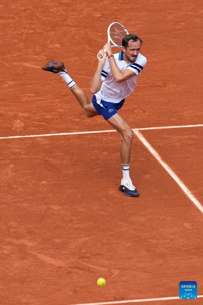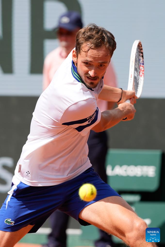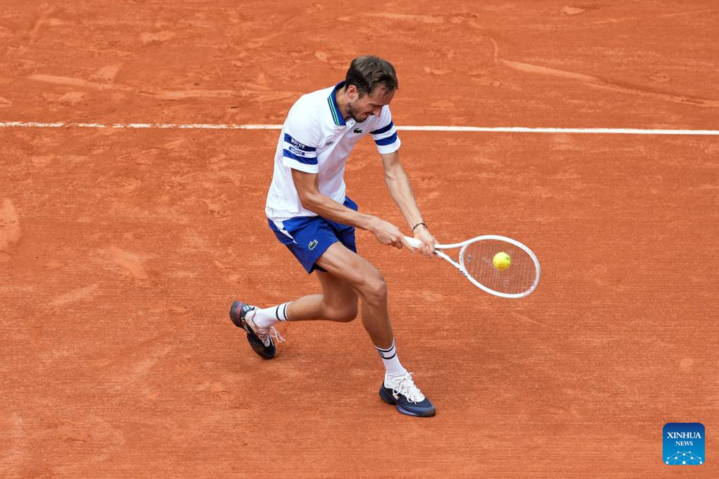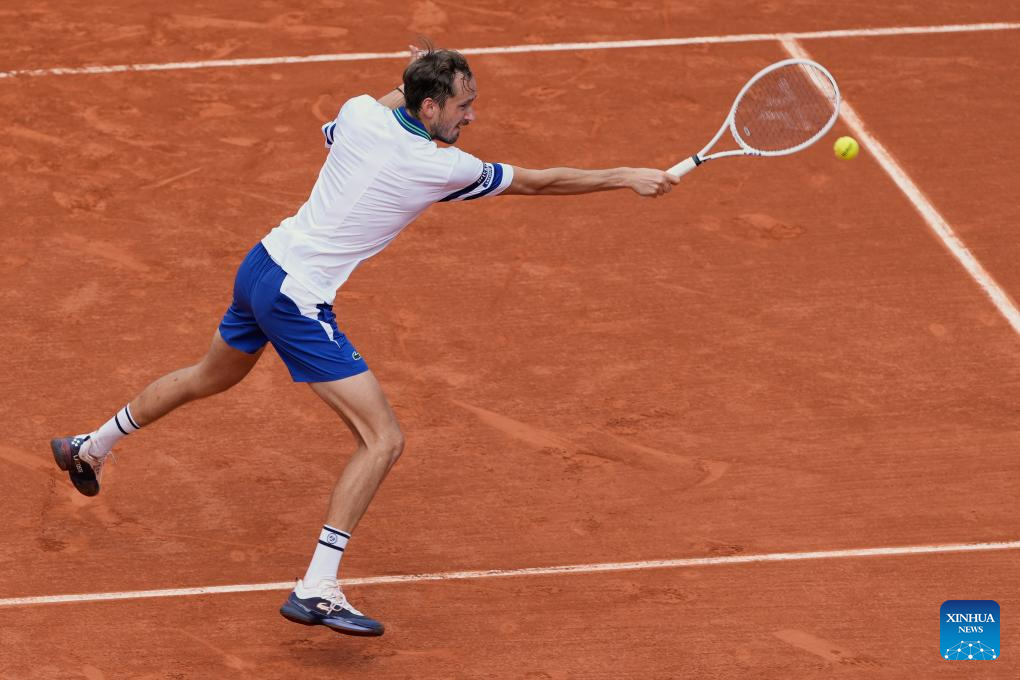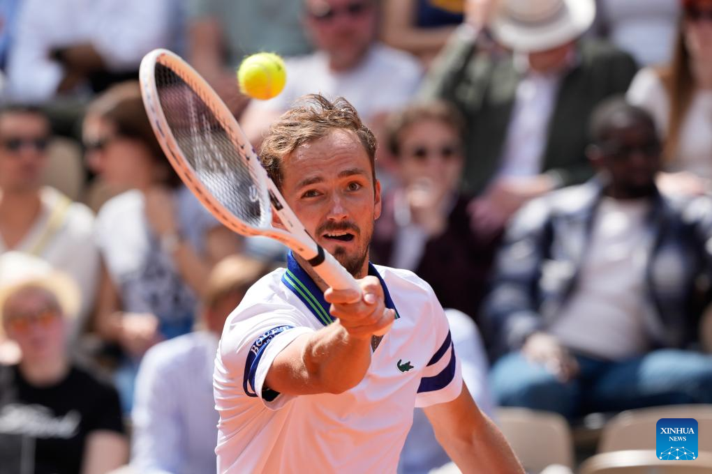 Daniil Medvedev hits a return during the men's singles fourth round match between Daniil Medvedev of Russia and Alex de Minaur of Australia at the French Open tennis tournament at Roland Garros in Paris, France, June 3, 2024. (Xinhua/Meng Dingbo)
