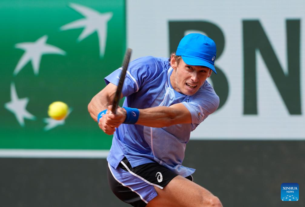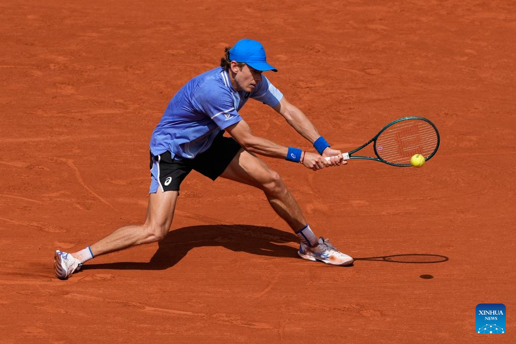 Alex de Minaur hits a return during the men's singles fourth round match between Daniil Medvedev of Russia and Alex de Minaur of Australia at the French Open tennis tournament at Roland Garros in Paris, France, June 3, 2024. (Xinhua/Meng Dingbo)