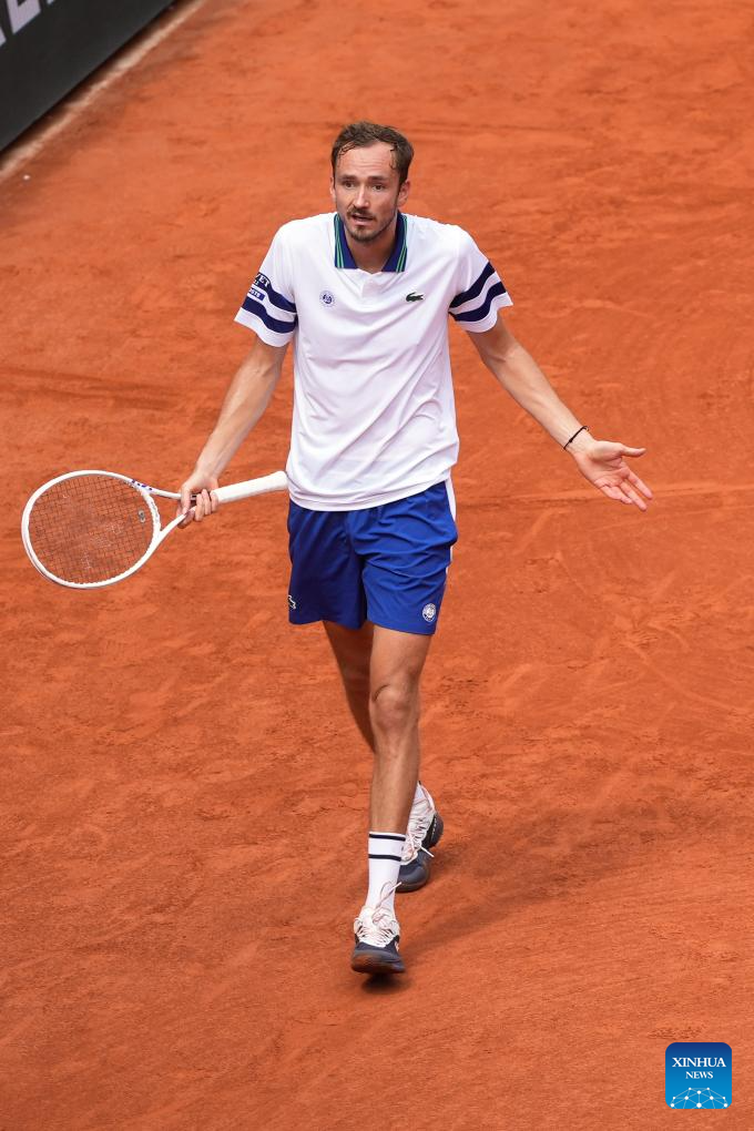 Daniil Medvedev reacts during the men's singles fourth round match between Daniil Medvedev of Russia and Alex de Minaur of Australia at the French Open tennis tournament at Roland Garros in Paris, France, June 3, 2024. (Xinhua/Meng Dingbo)