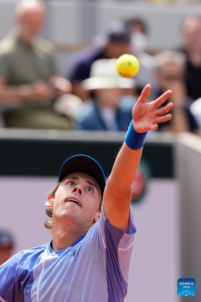 Alex de Minaur serves during the men's singles fourth round match between Daniil Medvedev of Russia and Alex de Minaur of Australia at the French Open tennis tournament at Roland Garros in Paris, France, June 3, 2024. (Xinhua/Meng Dingbo)