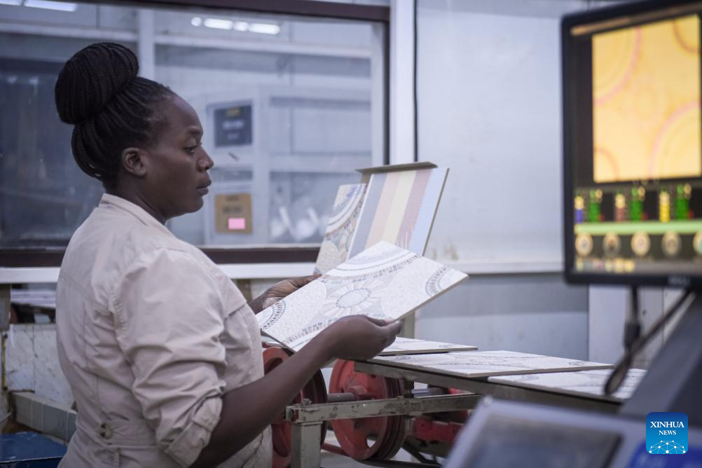 A worker observes tiles to be processed by ceramic inkjet printers at the KEDA (Kenya) ceramics factory in Kajiado County, Kenya, on May 17, 2024. (Xinhua/Li Yahui)