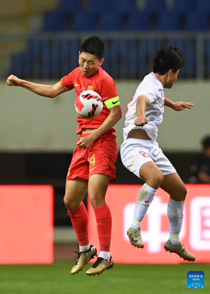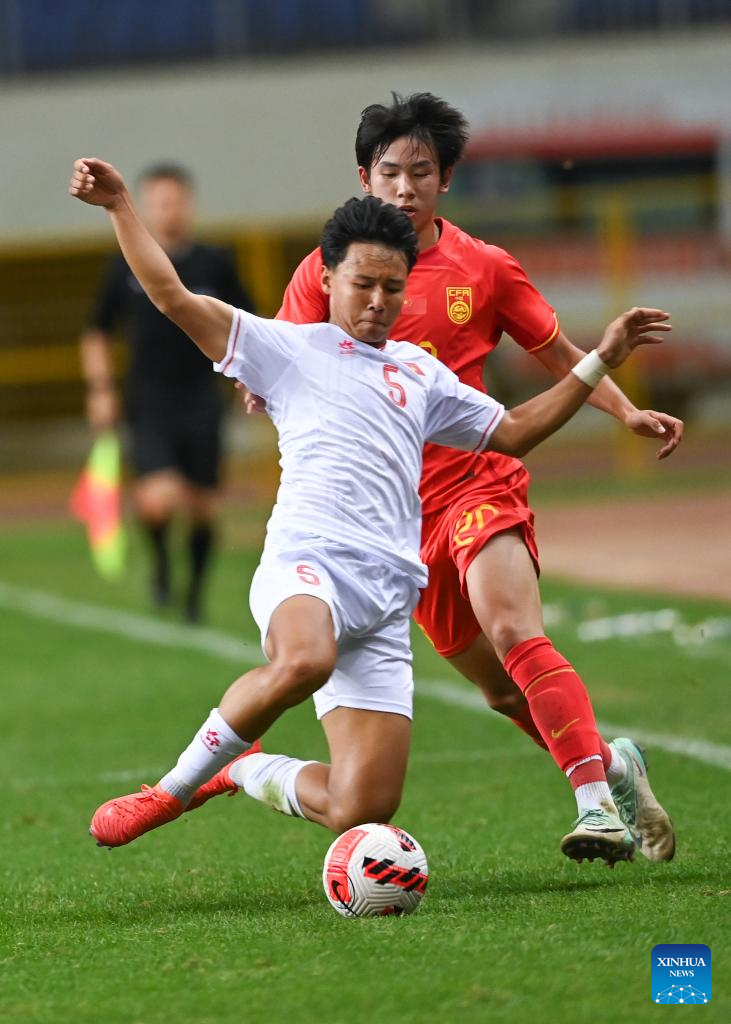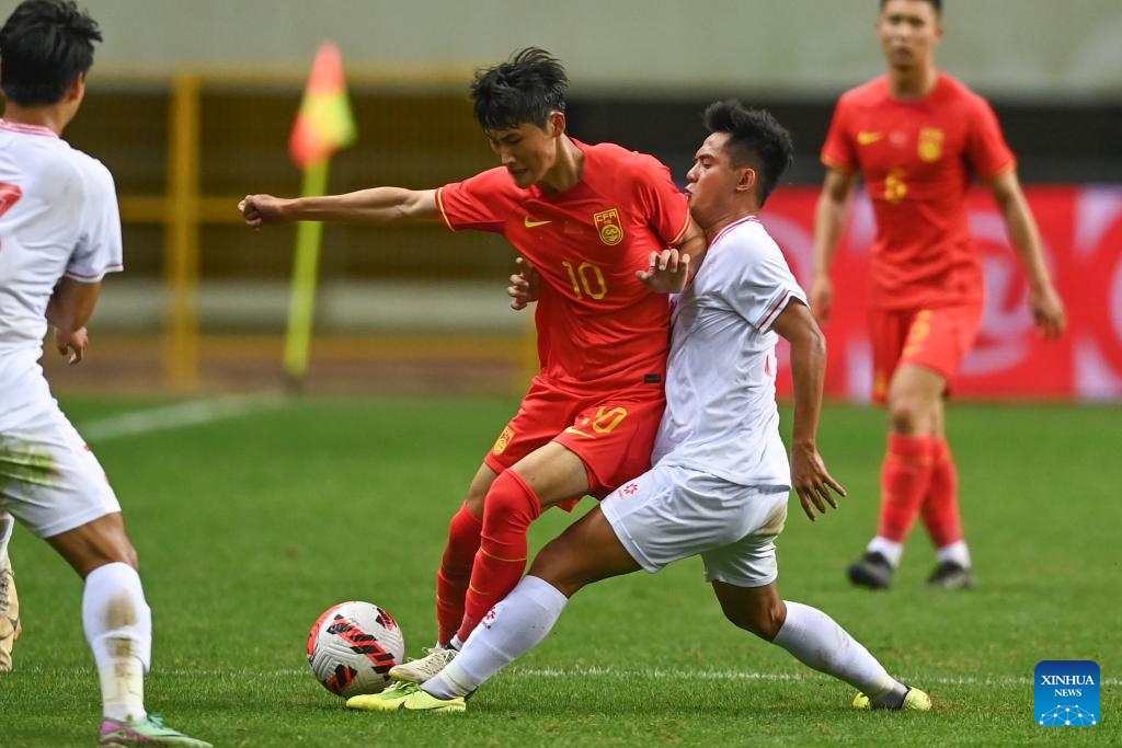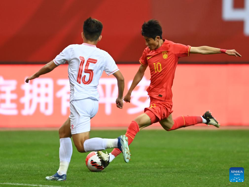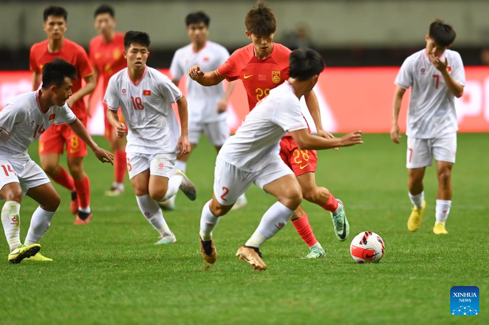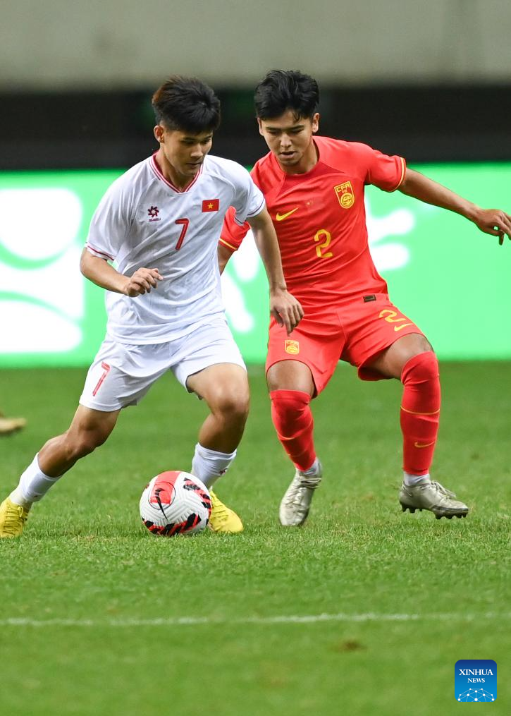 Liu Chengyu (C) of China vies for the ball during a friendly football match between the U19 teams of China and Vietnam in Weinan, northwest China's Shaanxi Province, June 4, 2024. (Xinhua/Zou Jingyi)