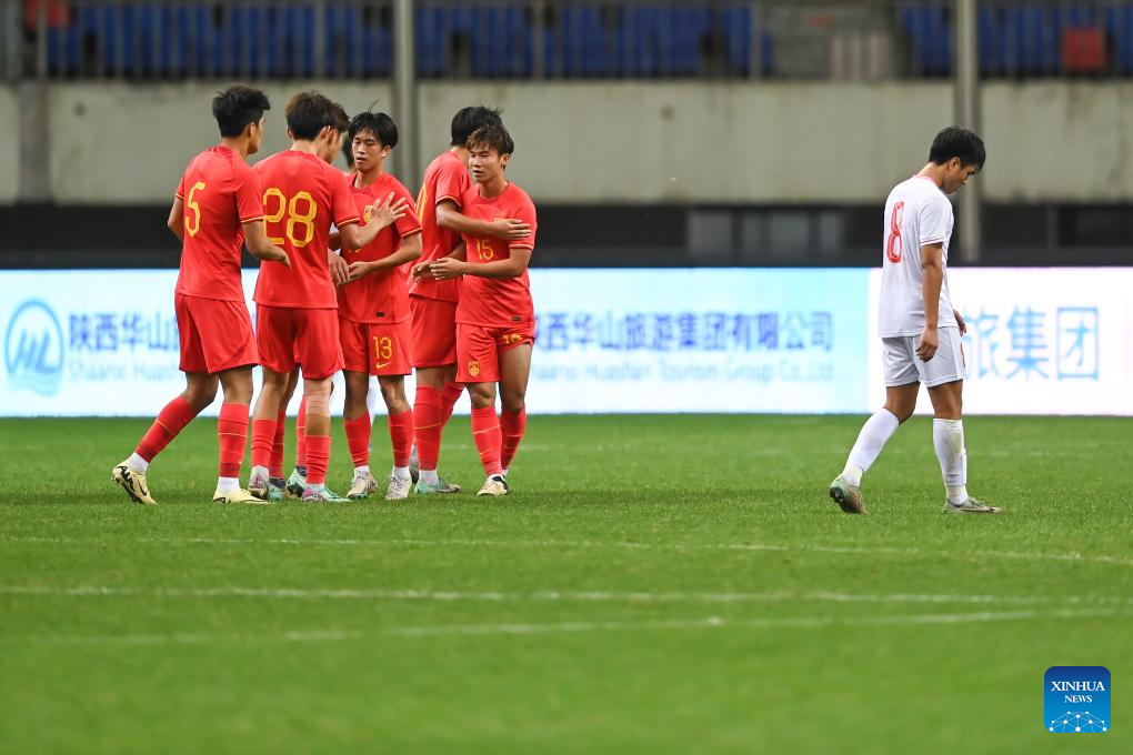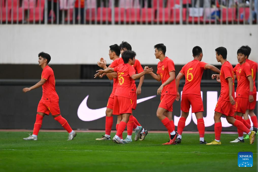 Players of China celebrate a goal during a friendly football match between the U19 teams of China and Vietnam in Weinan, northwest China's Shaanxi Province, June 4, 2024. (Xinhua/Zou Jingyi)