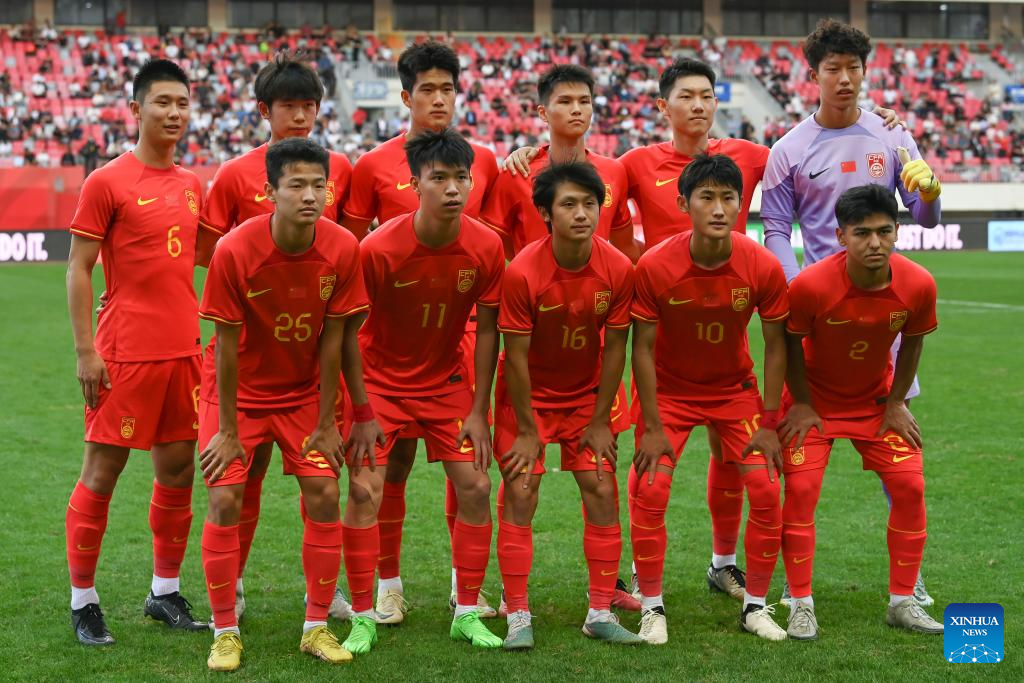 Starters of China pose prior to a friendly football match between the U19 teams of China and Vietnam in Weinan, northwest China's Shaanxi Province, June 4, 2024. (Xinhua/Zou Jingyi)