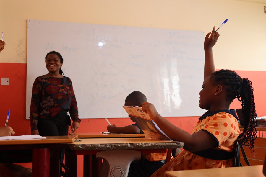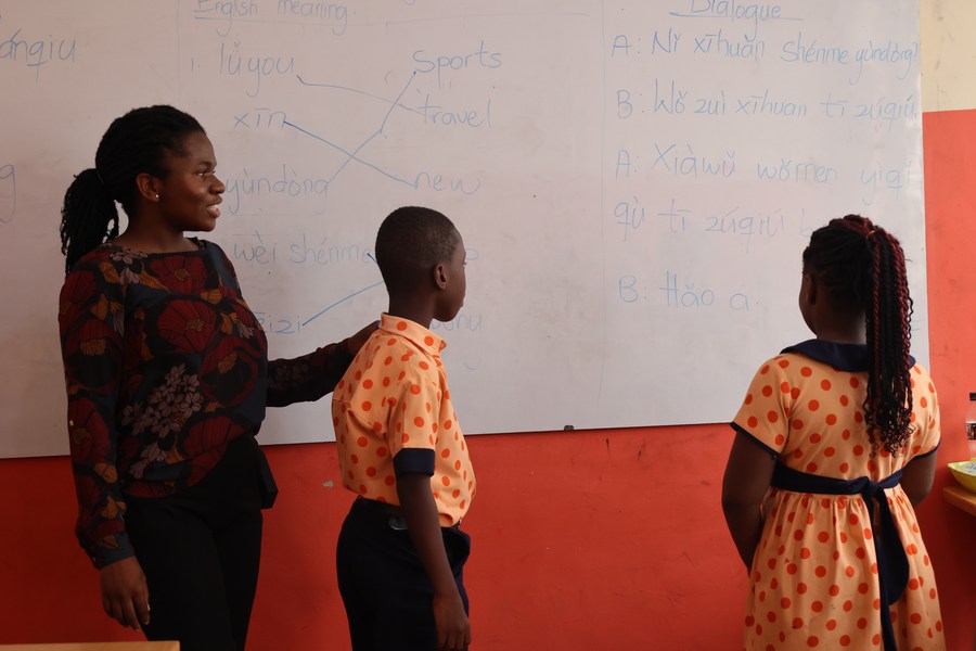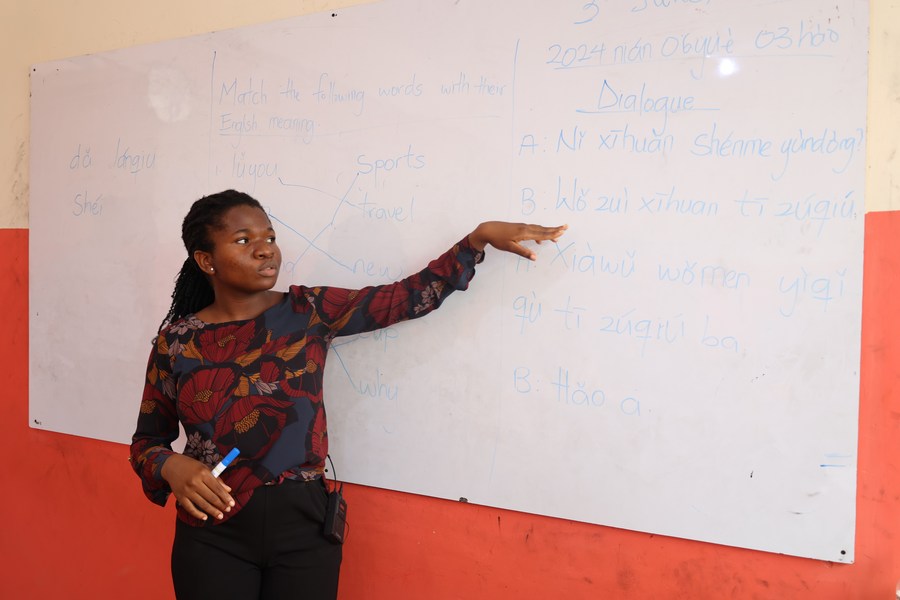 A teacher gives a Chinese language class at the Happy Heart Montessori School at Dome Pillar 2, a suburb of the Ghanaian capital of Accra, June 3, 2024. (Photo by Seth/Xinhua)