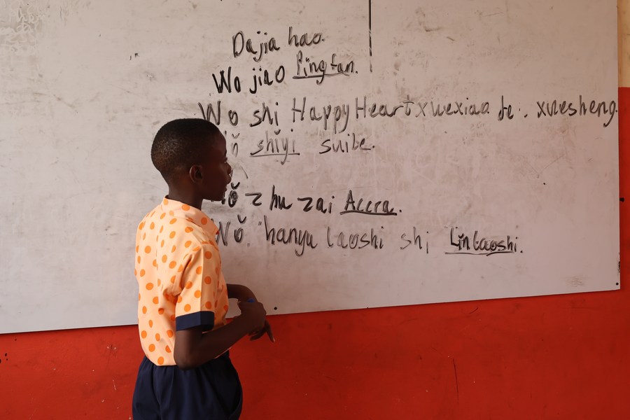 A student attends a Chinese language class at the Happy Heart Montessori School at Dome Pillar 2, a suburb of the Ghanaian capital of Accra, June 3, 2024. (Photo by Seth/Xinhua)