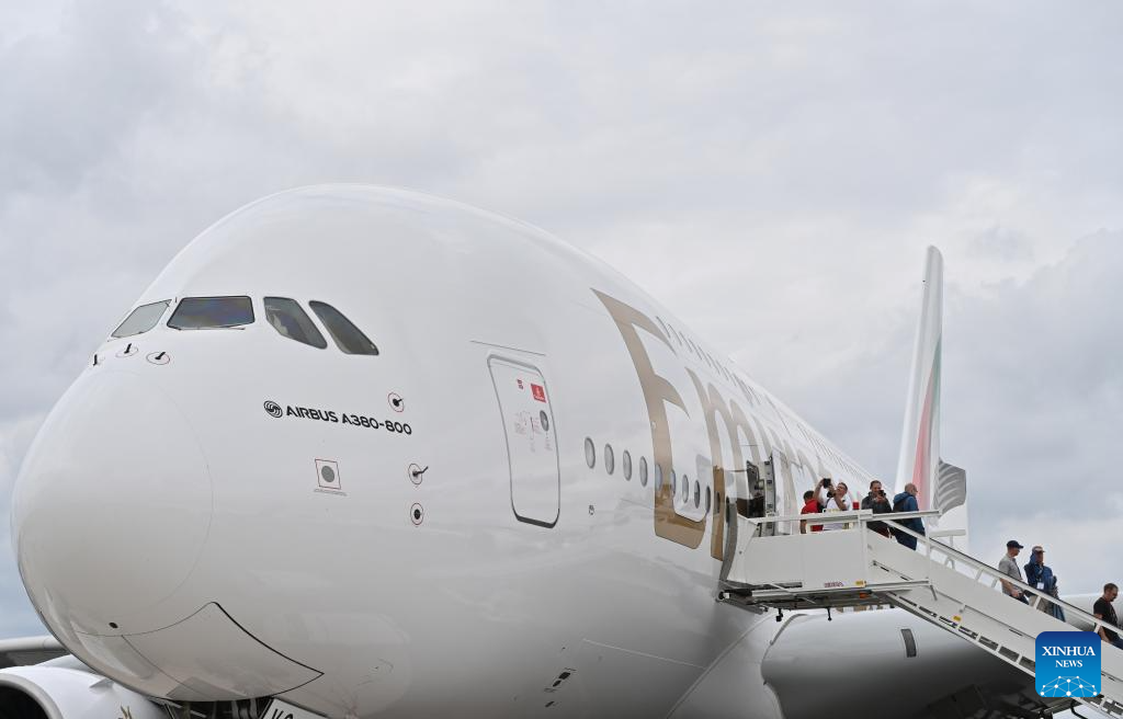 People view an Airbus A380-800 aircraft at the ILA Berlin Air Show in Schoenefeld, Germany, on June 5, 2024. With the participation of about 600 exhibitors, the ILA Berlin Air Show 2024 kicked off here on Wednesday and will last until Sunday. (Xinhua/Ren Pengfei)