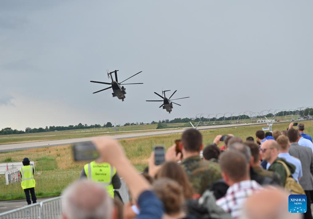 People view helicopters performing at the ILA Berlin Air Show in Schoenefeld, Germany, on June 5, 2024. With the participation of about 600 exhibitors, the ILA Berlin Air Show 2024 kicked off here on Wednesday and will last until Sunday. (Xinhua/Ren Pengfei)