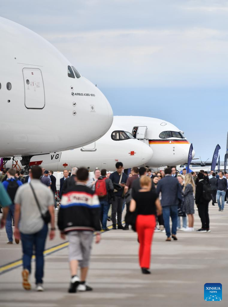 People view the aircraft displayed at the ILA Berlin Air Show in Schoenefeld, Germany, on June 5, 2024. With the participation of about 600 exhibitors, the ILA Berlin Air Show 2024 kicked off here on Wednesday and will last until Sunday. (Xinhua/Ren Pengfei)