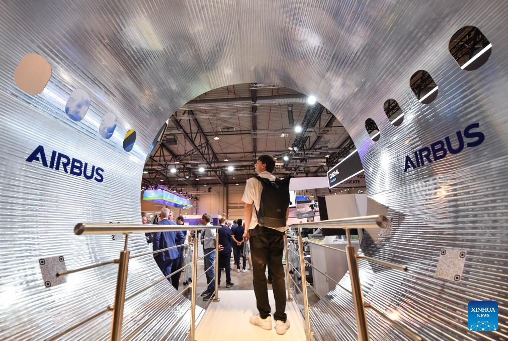 A man visits the booth of Airbus at the ILA Berlin Air Show in Schoenefeld, Germany, on June 5, 2024. With the participation of about 600 exhibitors, the ILA Berlin Air Show 2024 kicked off here on Wednesday and will last until Sunday. (Xinhua/Ren Pengfei)
