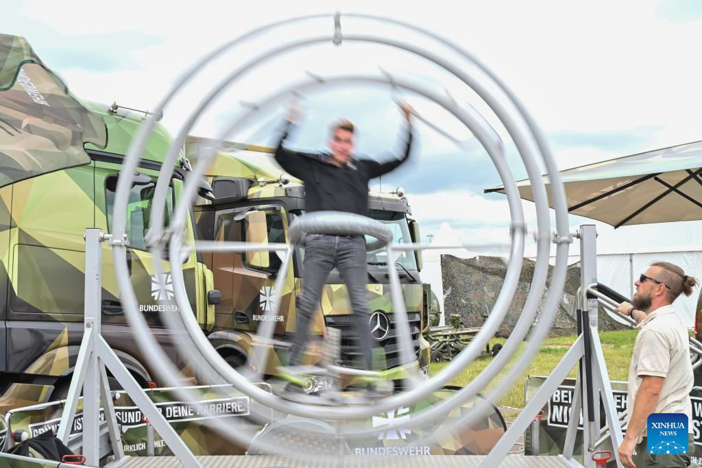 A visitor experiences the roller training at the ILA Berlin Air Show in Schoenefeld, Germany, on June 5, 2024. With the participation of about 600 exhibitors, the ILA Berlin Air Show 2024 kicked off here on Wednesday and will last until Sunday. (Xinhua/Ren Pengfei)