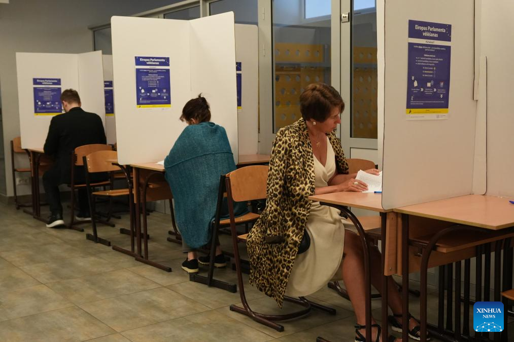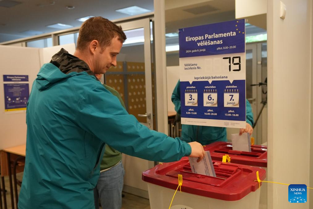 A man casts his vote for the European Parliament elections at a polling station in Riga, Latvia, June 8, 2024. (Photo by Janis Laizans/Xinhua)