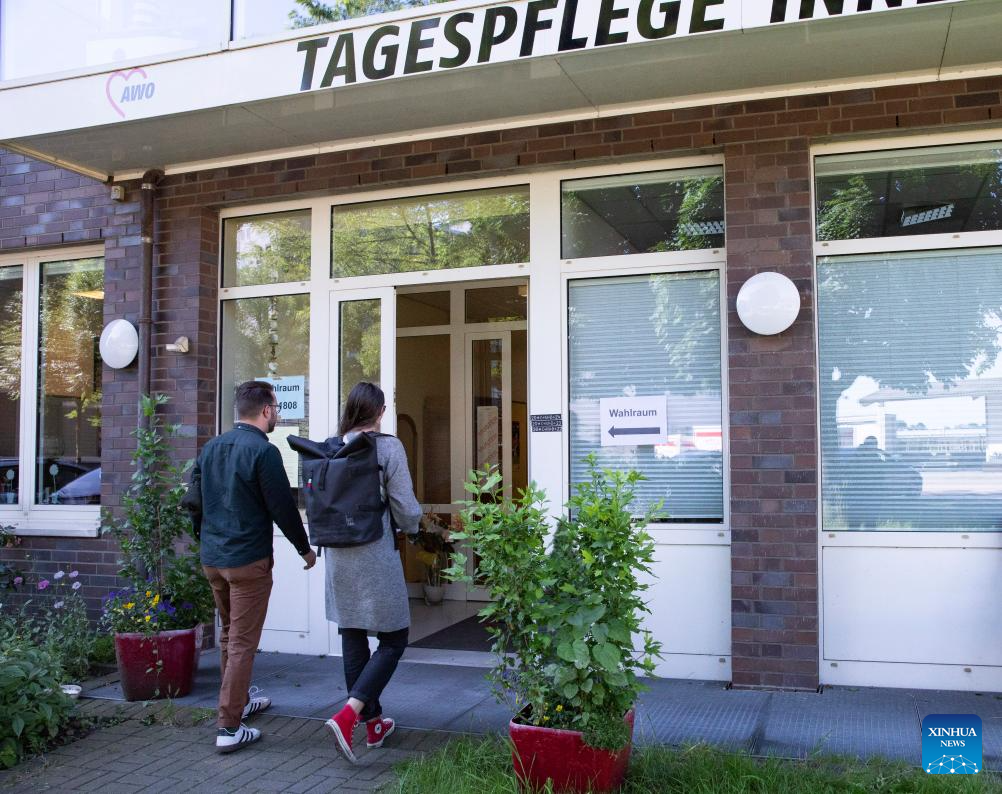 Two voters walk into a polling station for the European Parliament elections in Duisburg, Germany, June 9, 2024. (Xinhua/Zhang Fan)