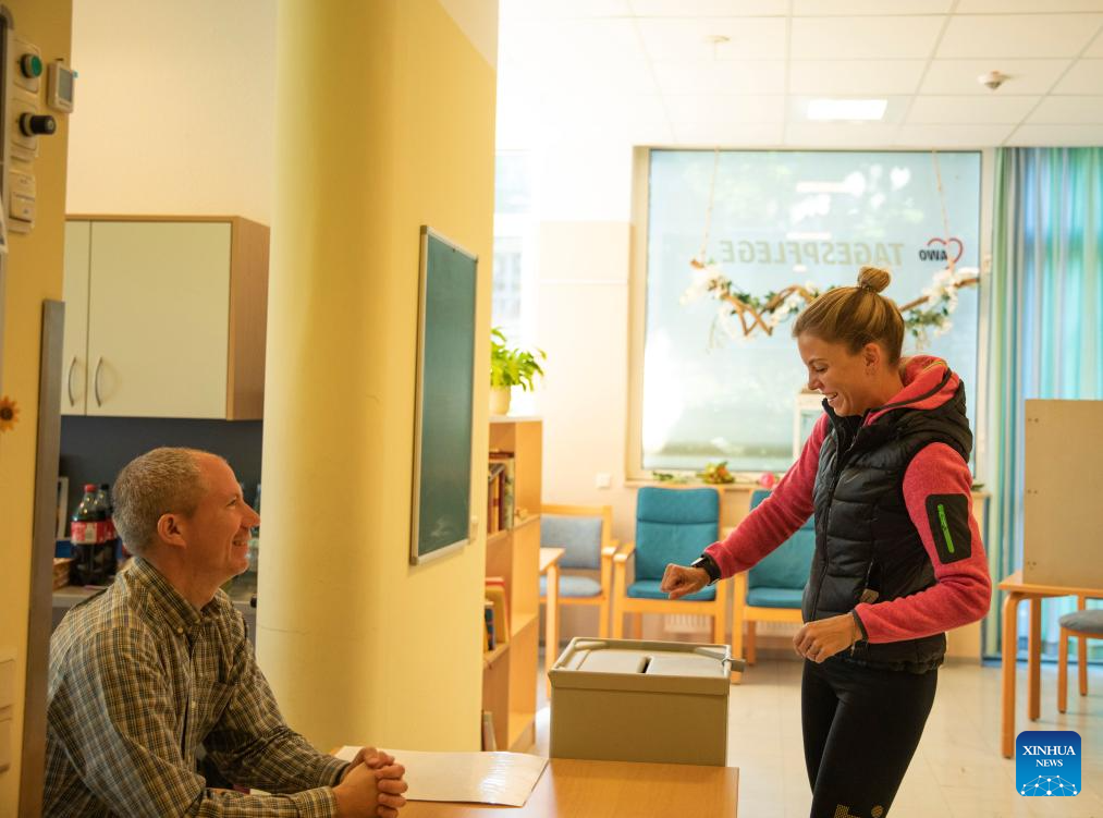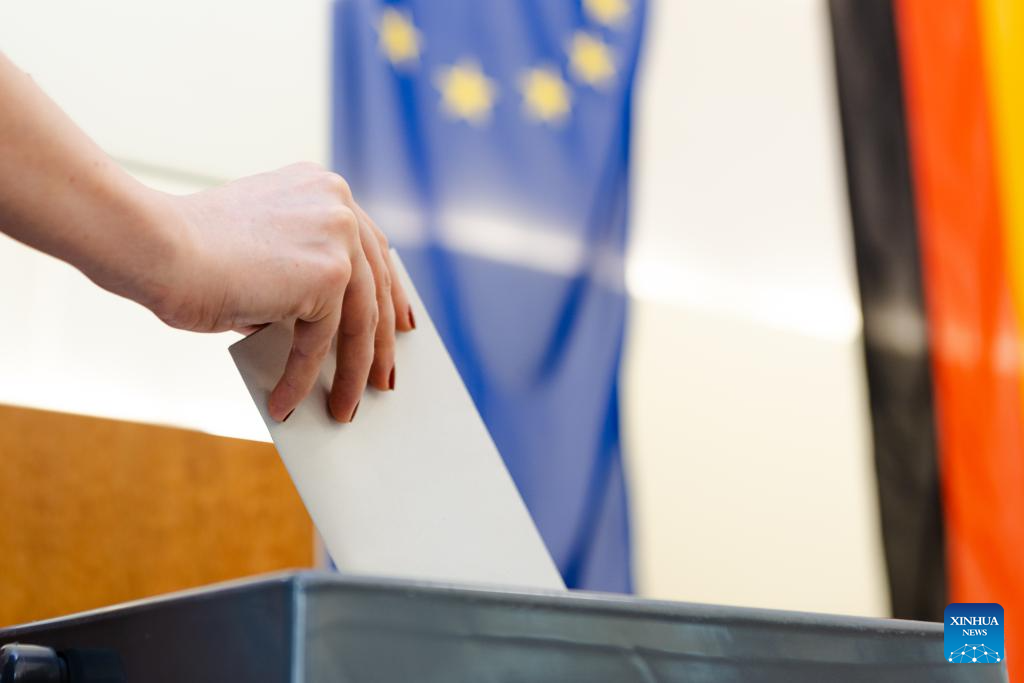 A voter casts her vote at a polling station for the European Parliament elections in Duisburg, Germany, June 9, 2024. (Xinhua/Zhang Fan)