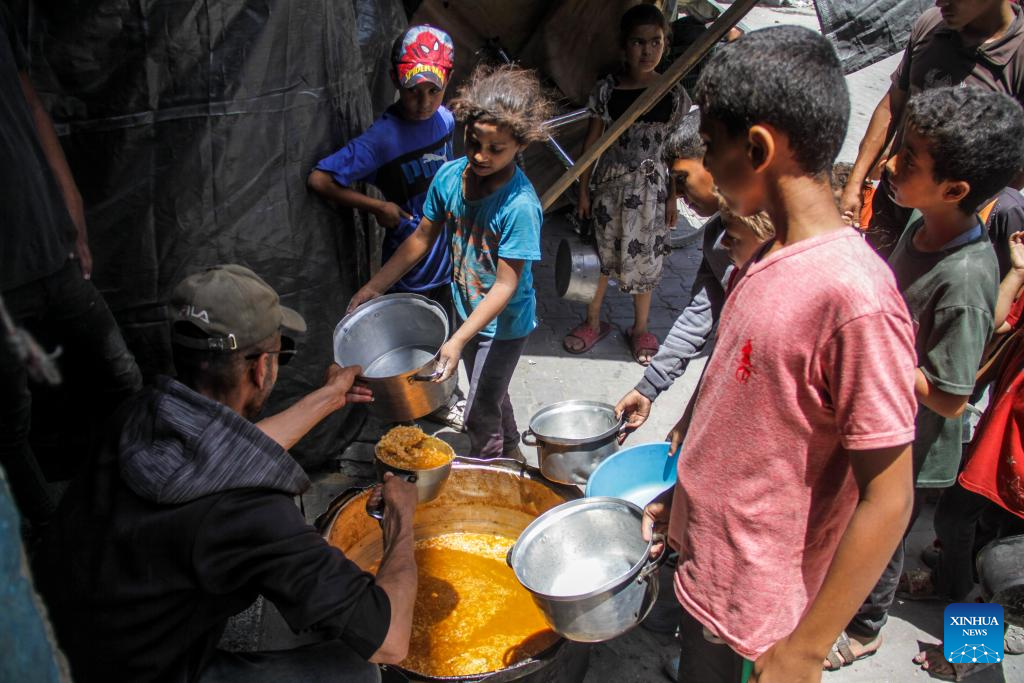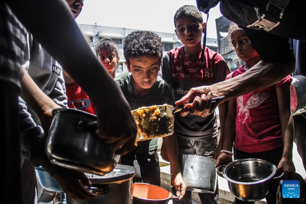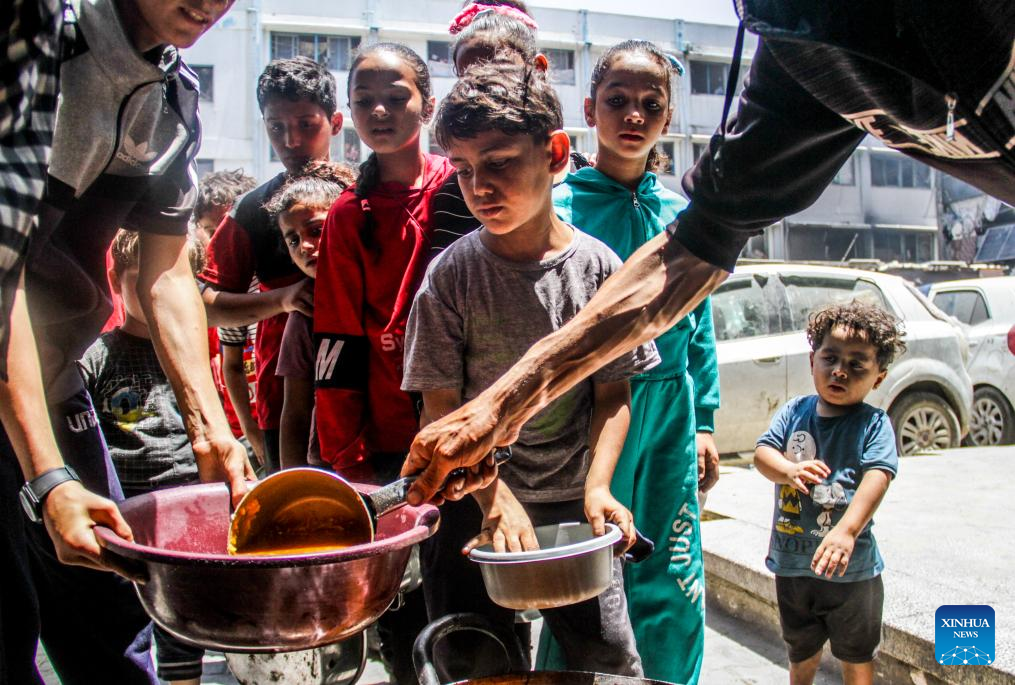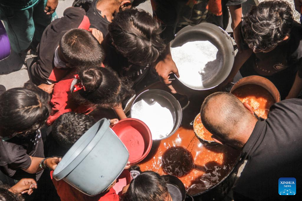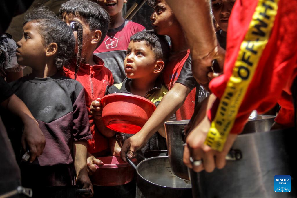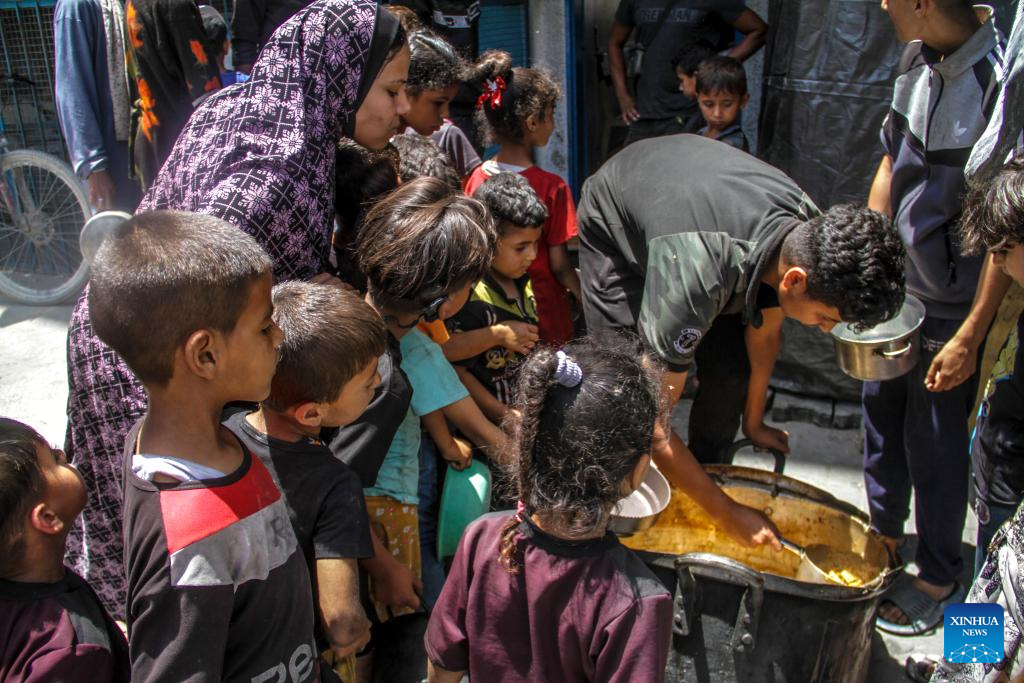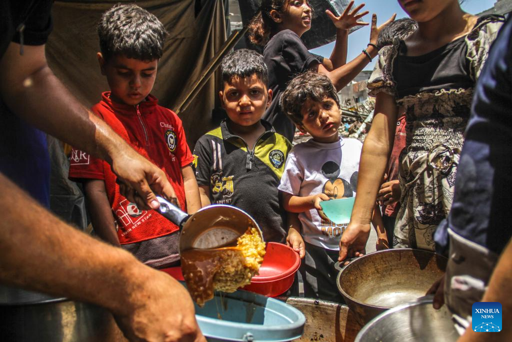 Children receive food relief at Jabalia refugee camp in the northern Gaza Strip city of Jabalia, on June 8, 2024. (Photo by Mahmoud Zaki/Xinhua)