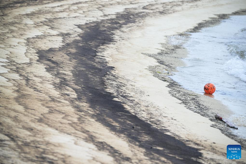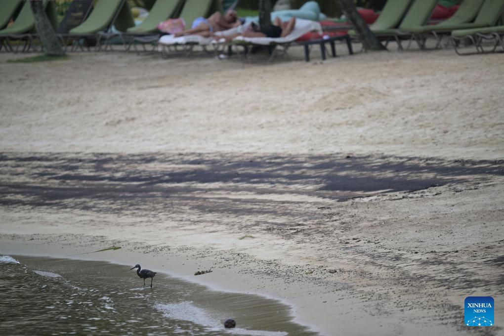 Oil stains are seen on Siloso beach of Sentosa island in Singapore, June 15, 2024. The Netherlands-flagged dredger Vox Maxima collided with Singapore-flagged bunker vessel Marine Honor at the Pasir Panjang Terminal on Friday, leading to oil leakage, said the Maritime and Port Authority of Singapore (MPA). (Xinhua/Then Chih Wey)