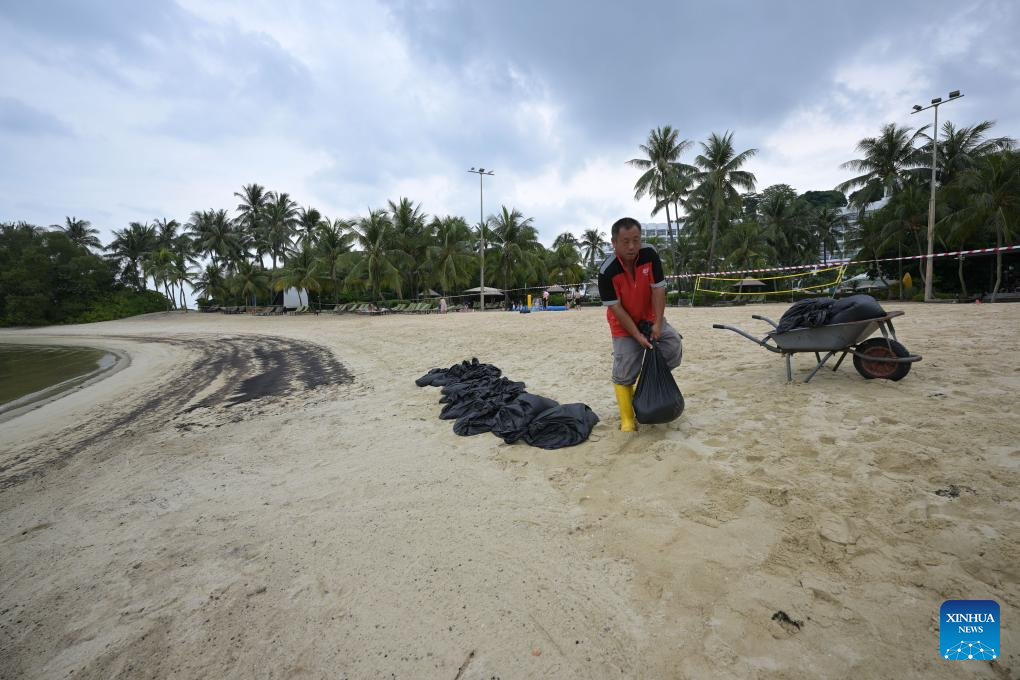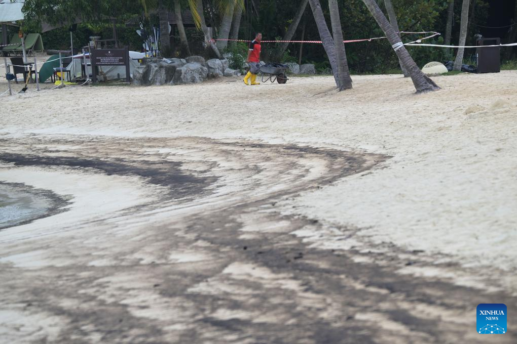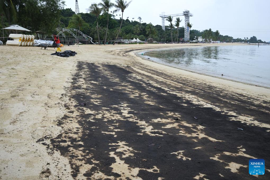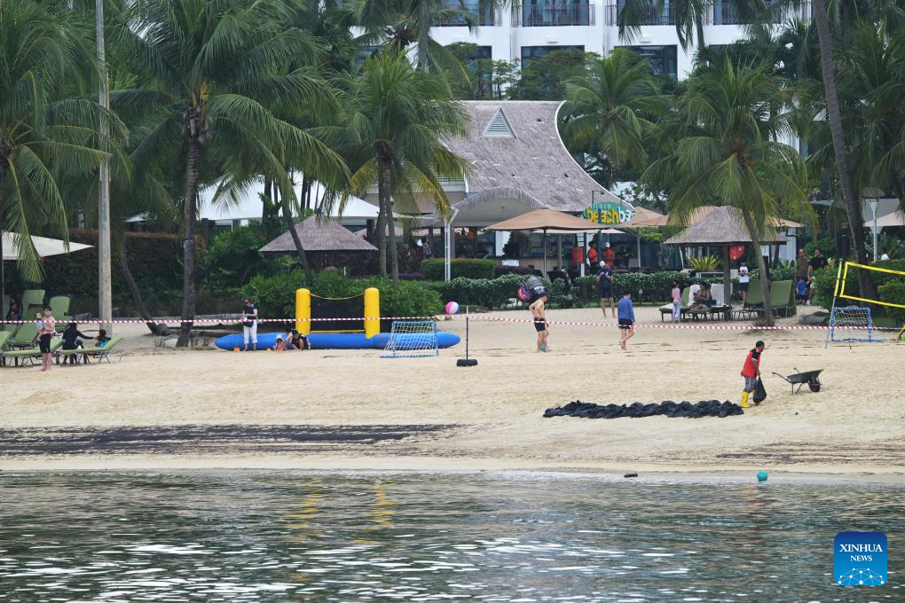 SINGAPORE, June 15 (Xinhua) -- Oil spillage was observed along beaches on Singapore's resort Sentosa island and the waters were closed for clean-up works, the island management authority said Saturday.