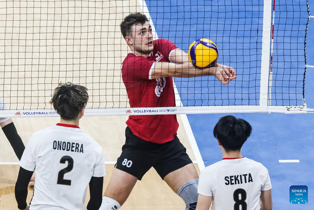 Stephen Timothy Maar (L) of Canada spikes the ball during the match between Canada and Japan at the Men's Volleyball Nations League (VNL) 2024 in Pasay City, the Philippines, on June 18, 2024. (Xinhua/Rouelle Umali)