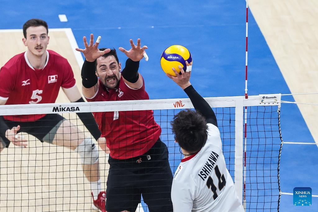 Ishikawa Yuki (R) of Japan spikes the ball against Stephen Timothy Maar (C) of Canada during the match between Canada and Japan at the Men's Volleyball Nations League (VNL) 2024 in Pasay City, the Philippines, on June 18, 2024. (Xinhua/Rouelle Umali)