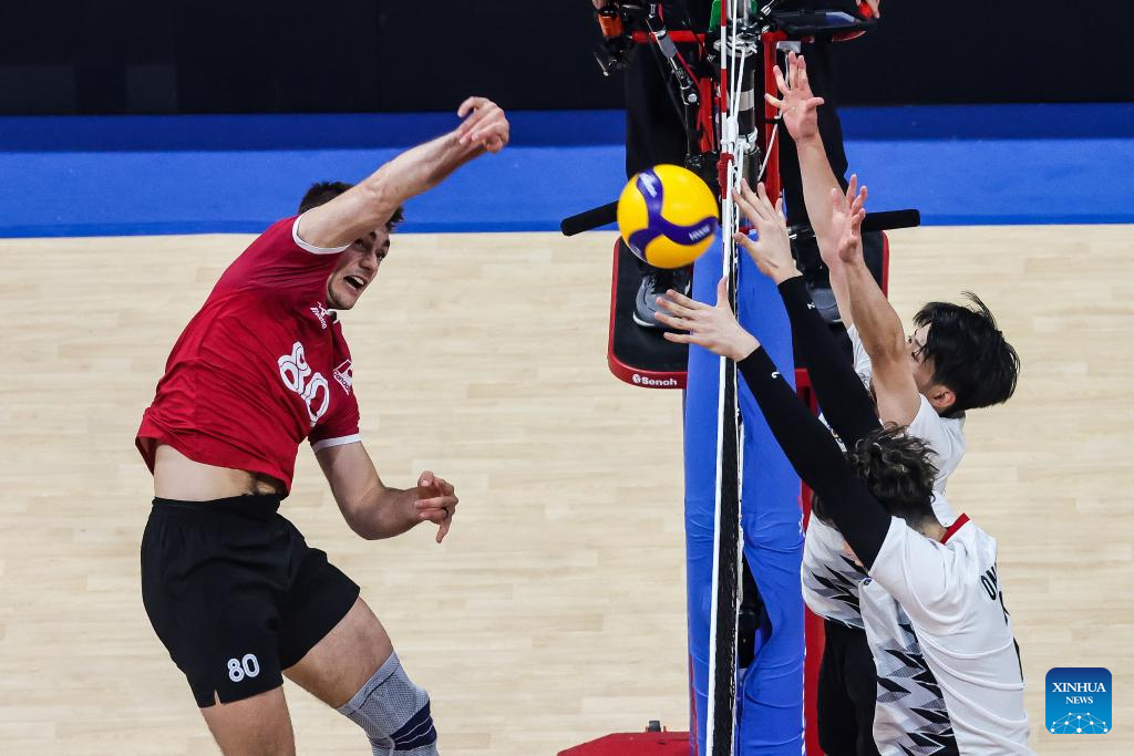 Stephen Timothy Maar (Top) of Canada tries to return the ball during the match between Canada and Japan at the Men's Volleyball Nations League (VNL) 2024 in Pasay City, the Philippines, on June 18, 2024. (Xinhua/Rouelle Umali)