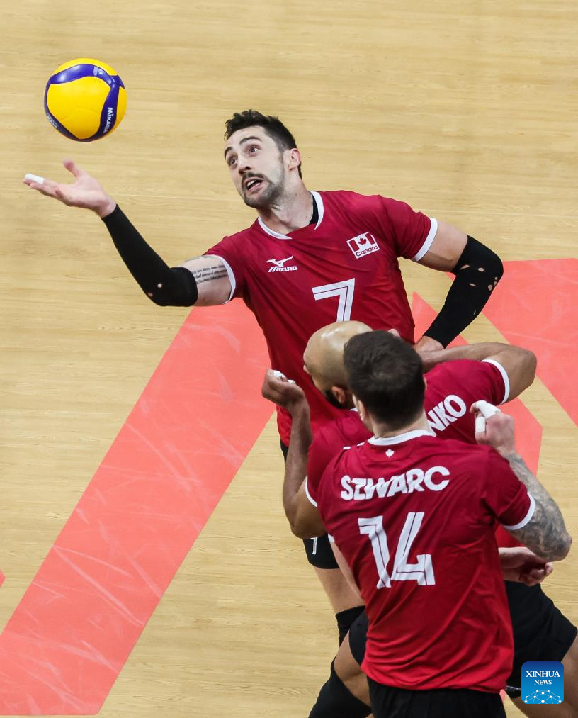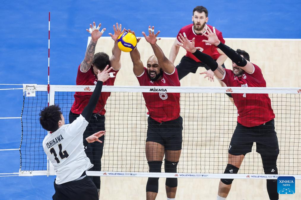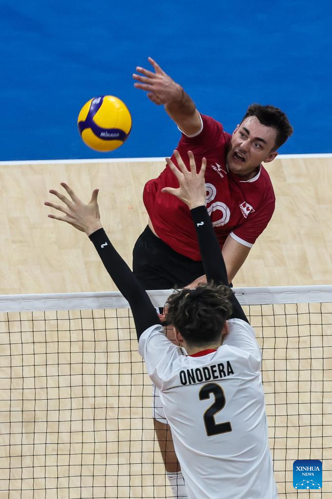Stephen Timothy Maar (1st R) of Canada spikes the ball during the match between Canada and Japan at the Men's Volleyball Nations League (VNL) 2024 in Pasay City, the Philippines, on June 18, 2024. (Xinhua/Rouelle Umali)