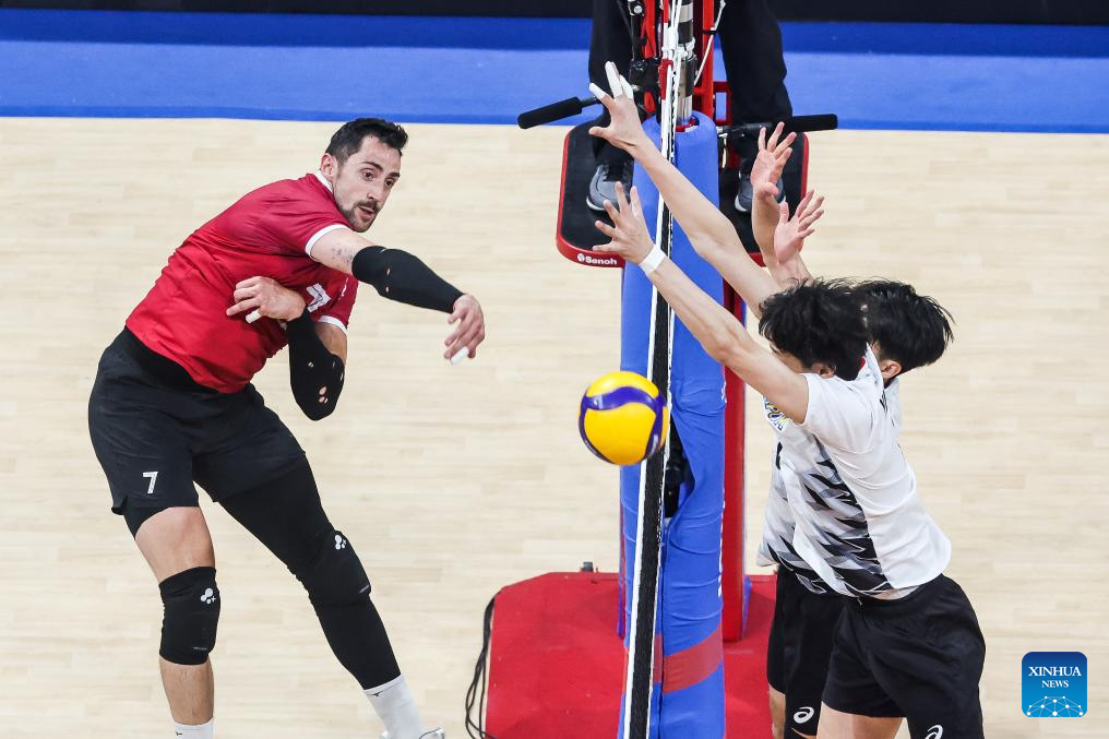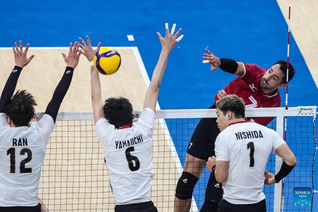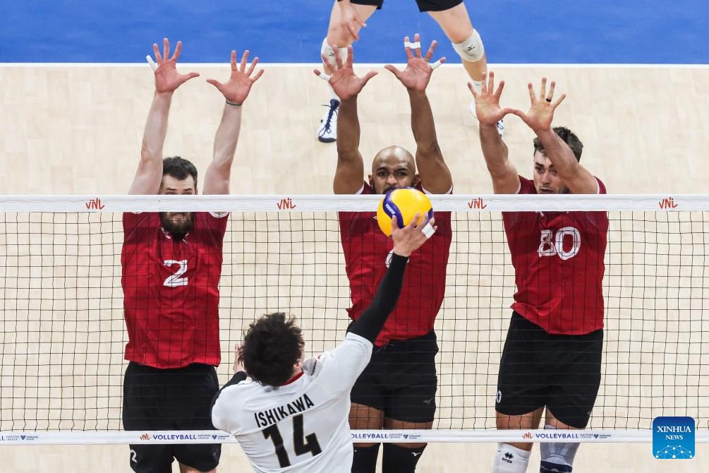 Ishikawa Yuki (1st L) of Japan spikes the ball during the match between Canada and Japan at the Men's Volleyball Nations League (VNL) 2024 in Pasay City, the Philippines, on June 18, 2024. (Xinhua/Rouelle Umali)