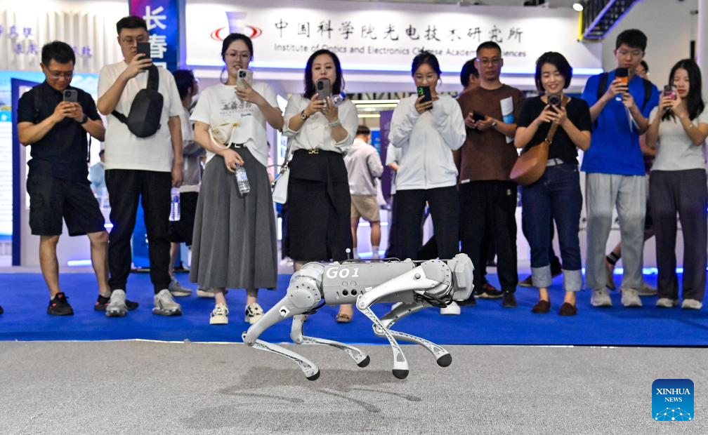 Visitors look at a robotic dog during the 2024 Changchun International Optoelectronic Expo in Changchun, northeast China's Jilin Province, June 18, 2024.