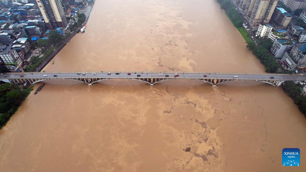 An aerial drone photo taken on June 18, 2024 shows surging water flow in the section of Rongjiang River in Rong'an County, south China's Guangxi Zhuang Autonomous Region. (Xinhua/Huang Xiaobang)